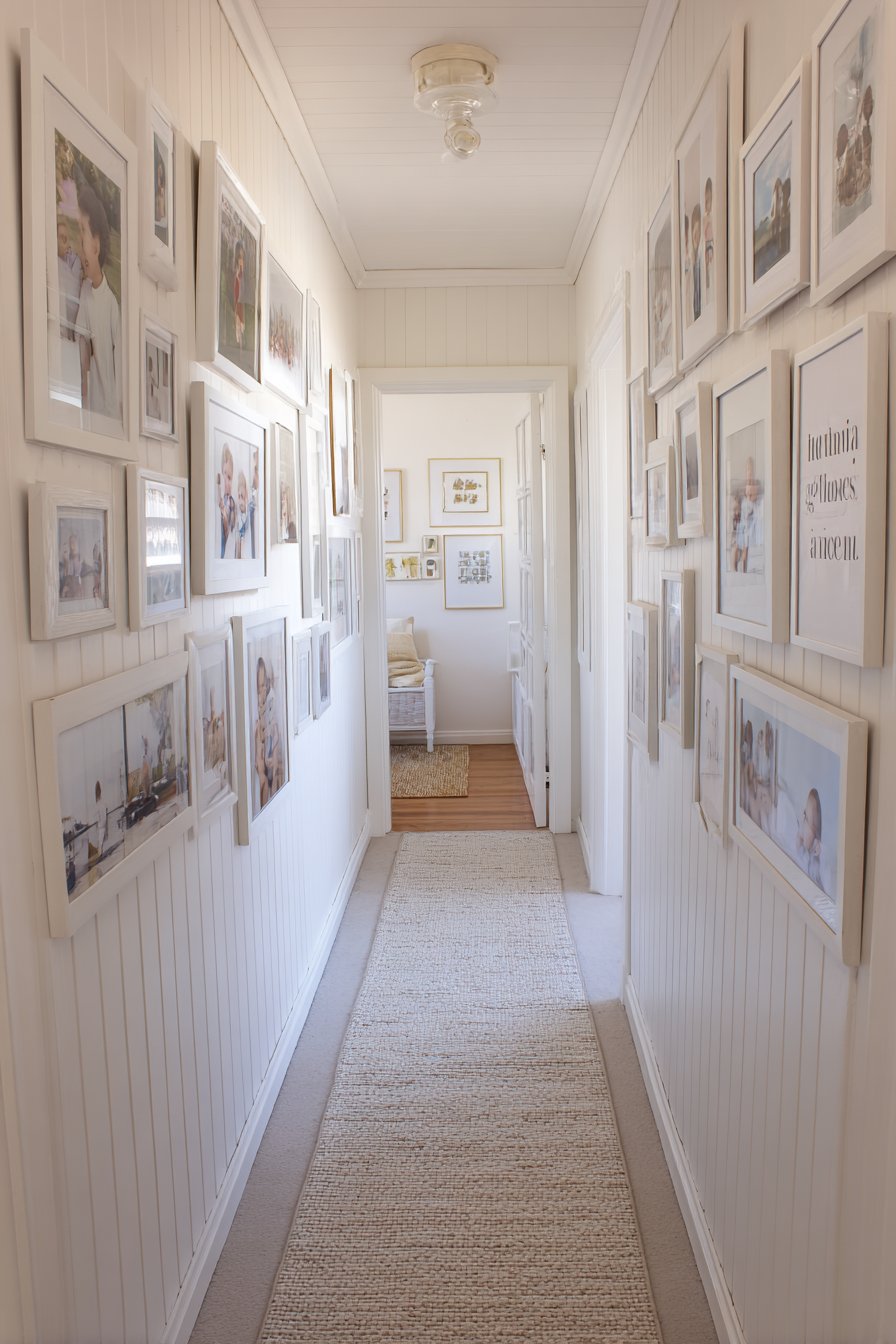 The vertical orientation works with rather than against the hallway’s proportions. Where horizontal arrangements might emphasize the narrow width and feel cramped, the vertical stack celebrates height and creates a sense of upward movement. The uniform white frames maintain simplicity appropriate for a potentially crowded sightline, while the varied content provides enough interest to warrant pausing and looking closely. The mix of sizes prevents monotony while the consistent finish ensures cohesion despite the variety.