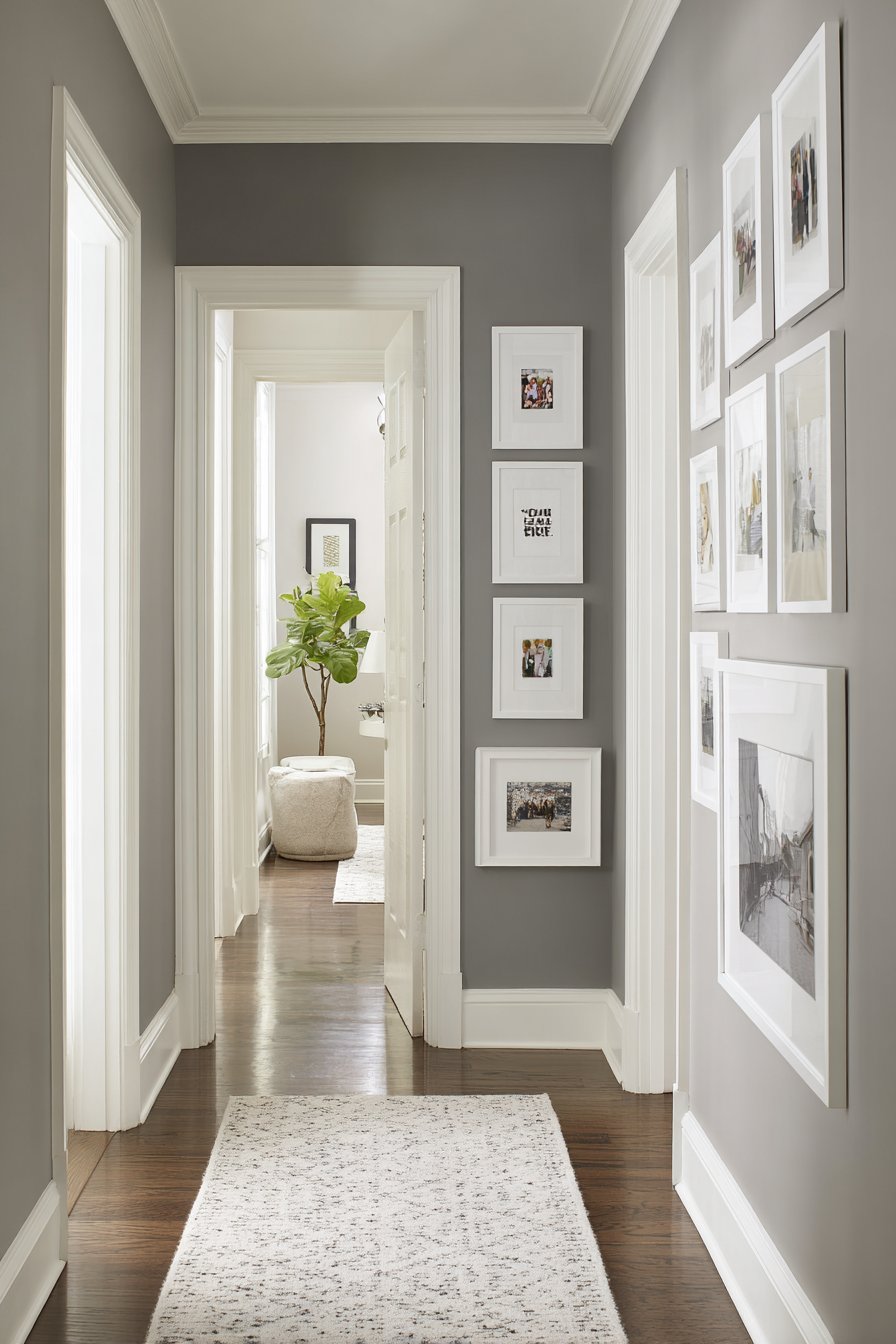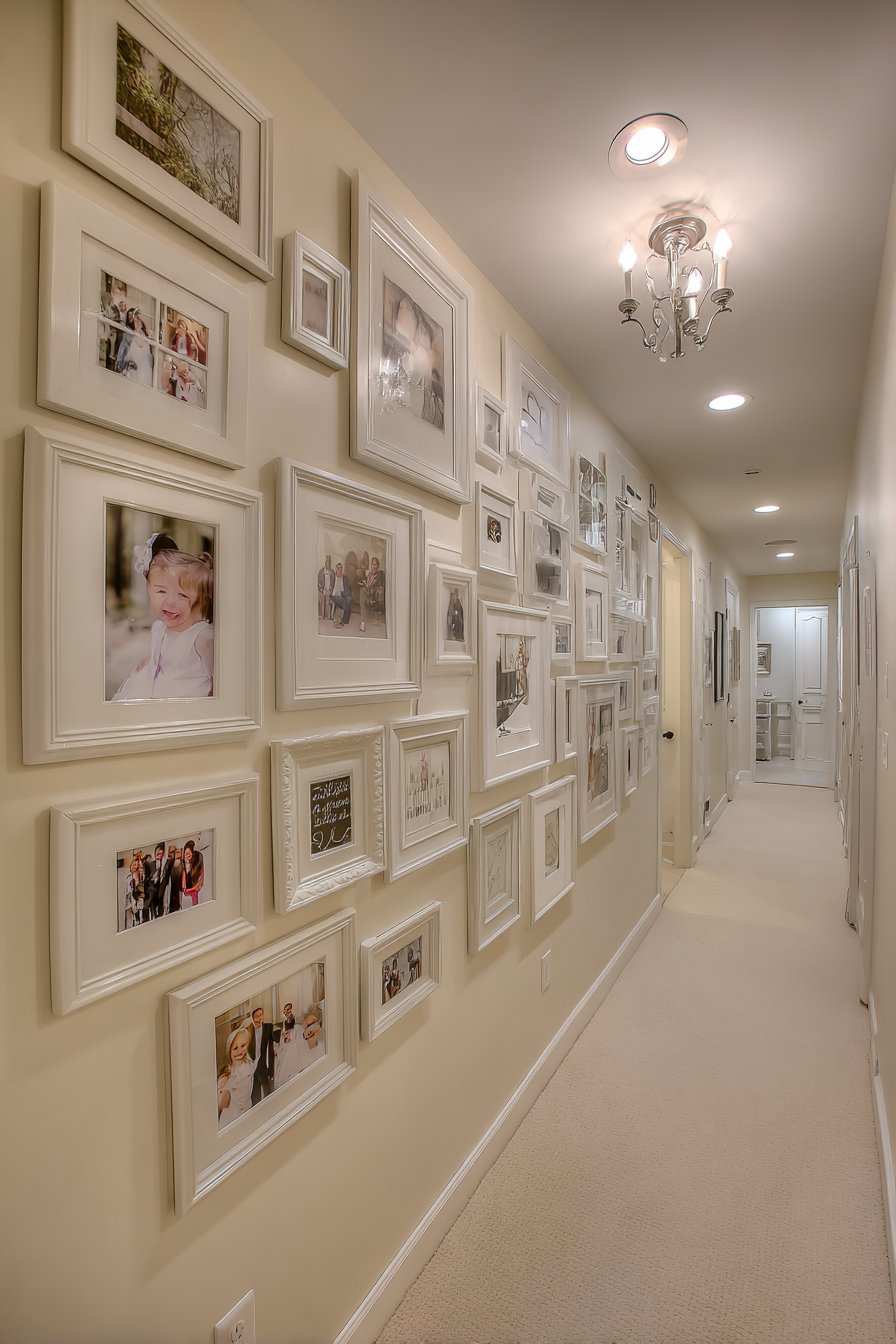Recessed hallway lighting provides even illumination that eliminates the dark, tunnel-like quality narrow hallways often suffer from. The white frames reflect available light, further brightening the space and making it feel more open and welcoming. The strategic placement between doorways means inhabitants pass by this gallery multiple times daily, allowing them to appreciate different pieces during each passing and creating an evolving relationship with the displayed images.