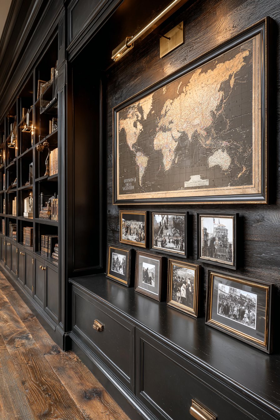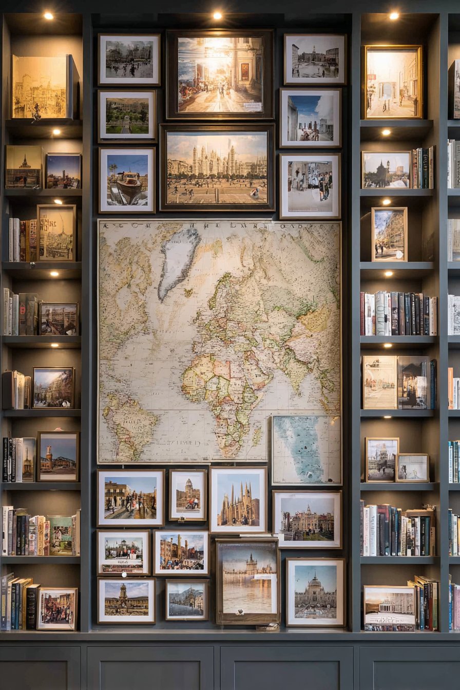 For wanderlust-filled homeowners, this travel-themed gallery wall in a home library creates a visual travel journal that celebrates global adventures. A large vintage world map serves as the dramatic centerpiece, its aged paper and antique cartography providing historical context and geographic reference. Surrounding the map, frames in dark wood and bronze finishes contain travel photography from various destinations—azure Mediterranean coastlines, bustling Asian street markets, African wildlife, South American landscapes. Small pins or subtle markers on the map connect to corresponding photographs, creating an interactive element that invites viewers to trace journeys and reminisce about adventures.