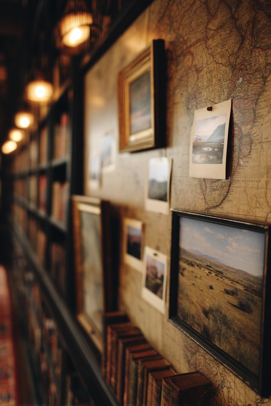 Built-in bookshelves flanking the display reinforce the library setting while providing practical storage for travel guides, atlases, and books about visited destinations. The combination of visual and textual travel resources creates an immersive environment for planning future adventures or reliving past ones. Warm library lighting creates an intimate atmosphere conducive to contemplation and storytelling, transforming the gallery wall into more than decoration—it becomes a lived experience documented and celebrated.
