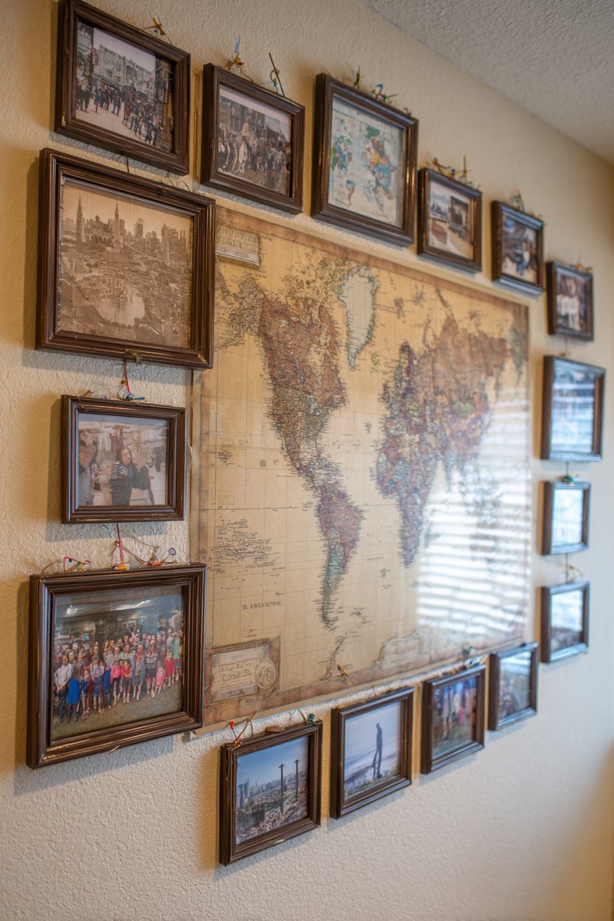 Key Design Tips: Choose a map large enough to serve as a genuine focal point—36×48 inches minimum for impact. Use matching or coordinating frame finishes for all surrounding photos to maintain cohesion. Position photographs strategically around the map to create balanced visual weight. Include a legend or simple labeling system connecting map pins to corresponding photographs. Mount the map center at 60 inches from the floor, then arrange photographs around it at varying heights to create organic flow.