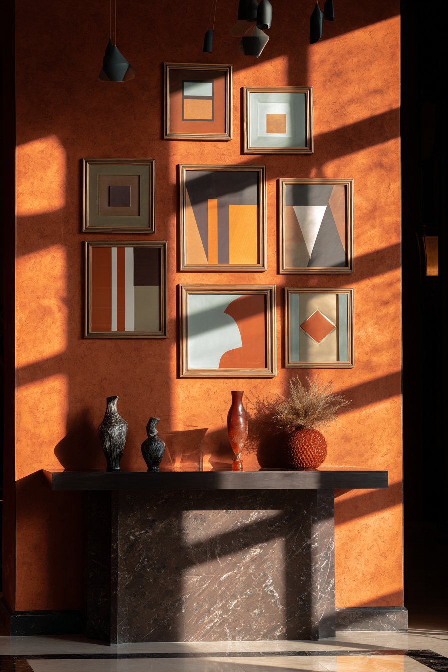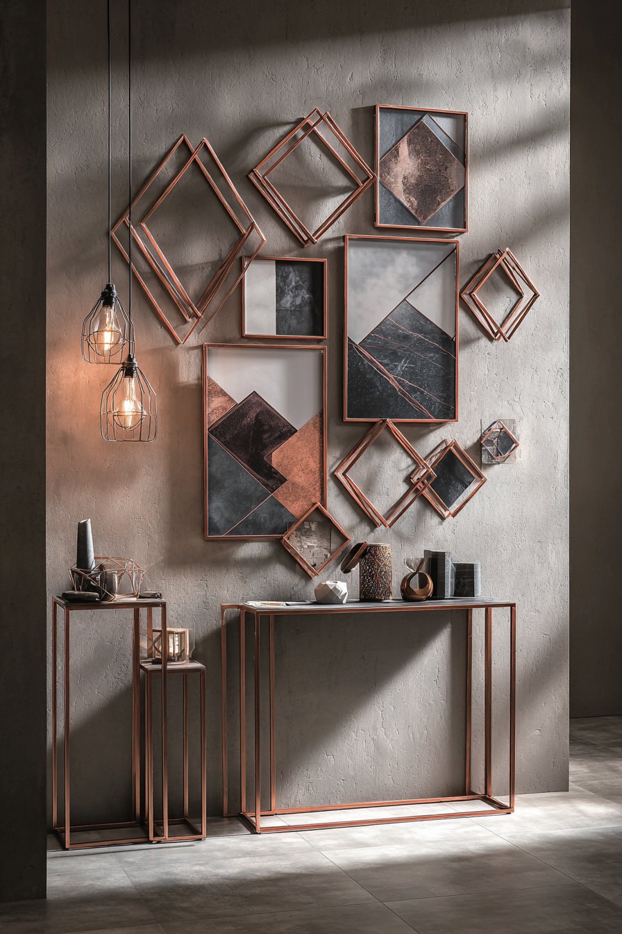 The narrow console table positioned below provides grounding for the floating geometric arrangement above, while sculptural decorative objects on its surface continue the geometric theme at a three-dimensional level. Pendant lighting casts dramatic shadows from the angular frames, creating an ever-changing display as natural light moves throughout the day. The entire composition feels curated and intentional, making a strong design statement in the crucial first impression space of the entryway.