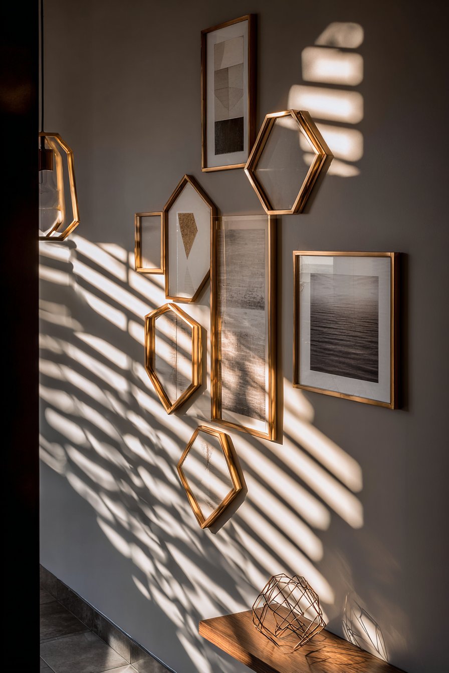 Contemporary art collectors and design enthusiasts will appreciate this bold geometric arrangement using non-traditional frame shapes. Hexagonal and diamond-shaped frames in matte gold and copper finishes contain abstract geometric artwork and modern photography arranged in an artistic cluster pattern on an entryway wall. The unconventional shapes immediately distinguish this display from standard rectangular galleries, while the metallic finishes catch and reflect light in ways that create visual movement and sparkle. The intentional negative space around the frames becomes as important as the frames themselves, creating dynamic interplay between art and empty wall.