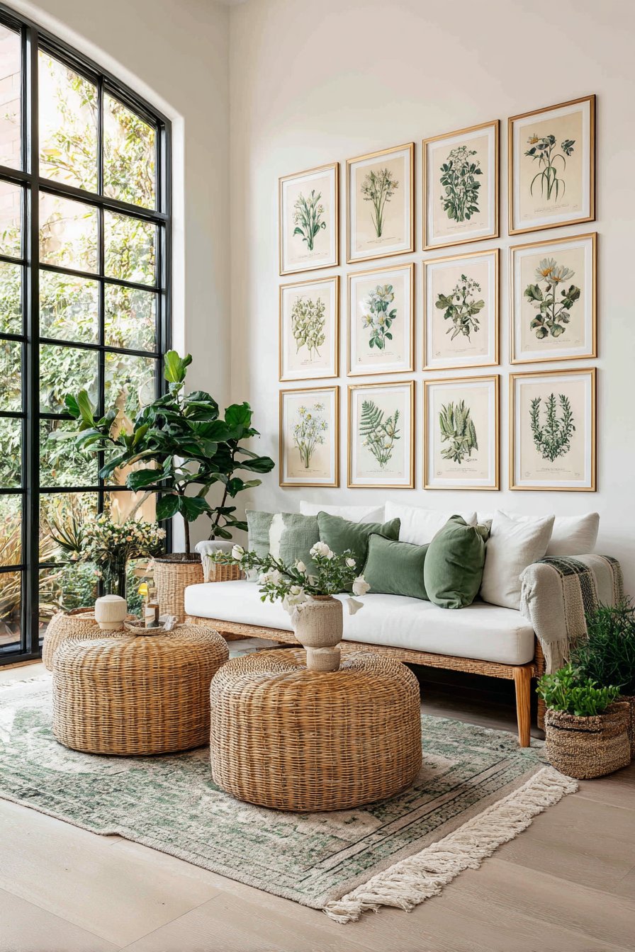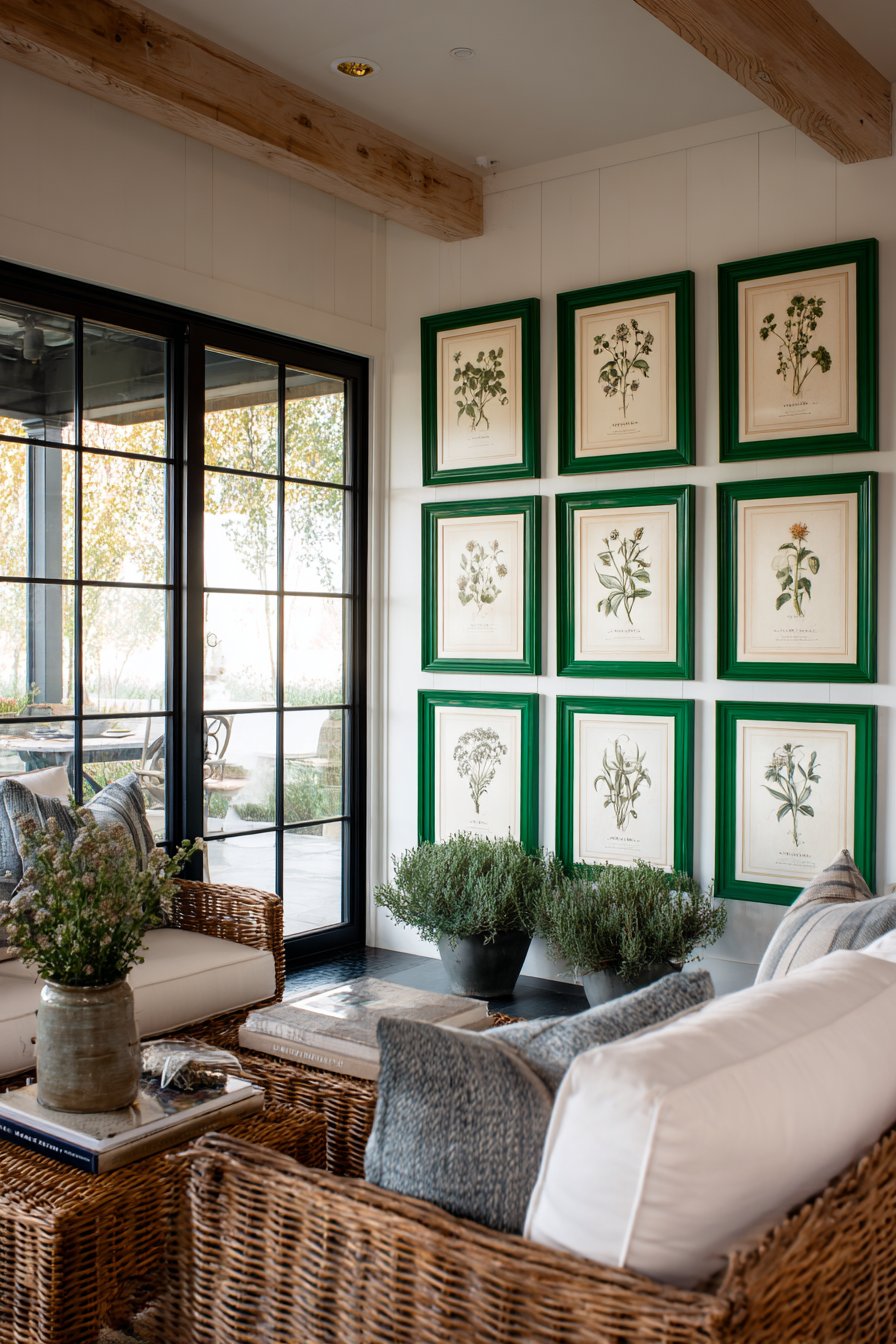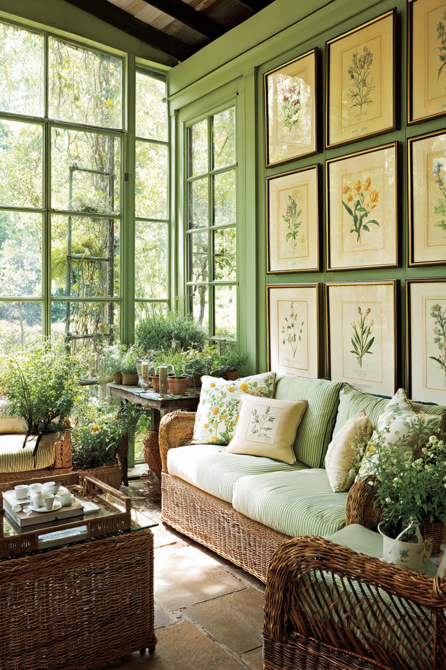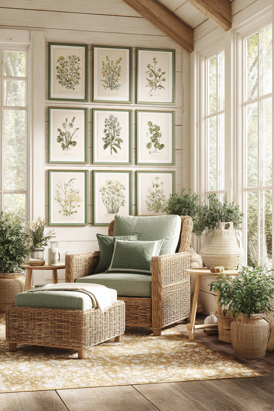 Nature-inspired design reaches its zenith in this botanical print collection displayed in a sunroom or garden room. Twelve vintage-style botanical illustrations in matching green frames with cream mats create a study-like atmosphere reminiscent of 19th-century natural history collections. The prints feature detailed drawings of herbs, flowers, and plants rendered with scientific precision yet artistic sensitivity. The repetition of frame style and matting creates a cohesive museum-quality presentation, while the subject matter perfectly complements the room’s function as a transitional space between indoor and outdoor environments.