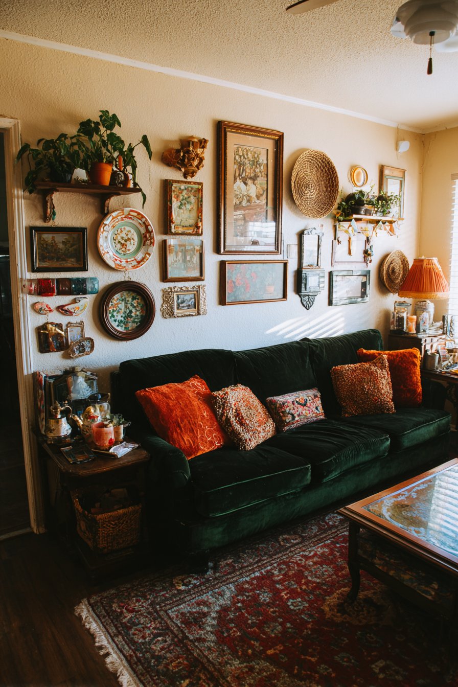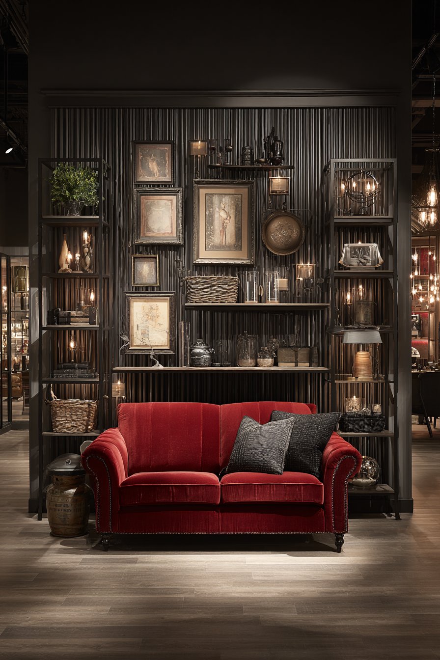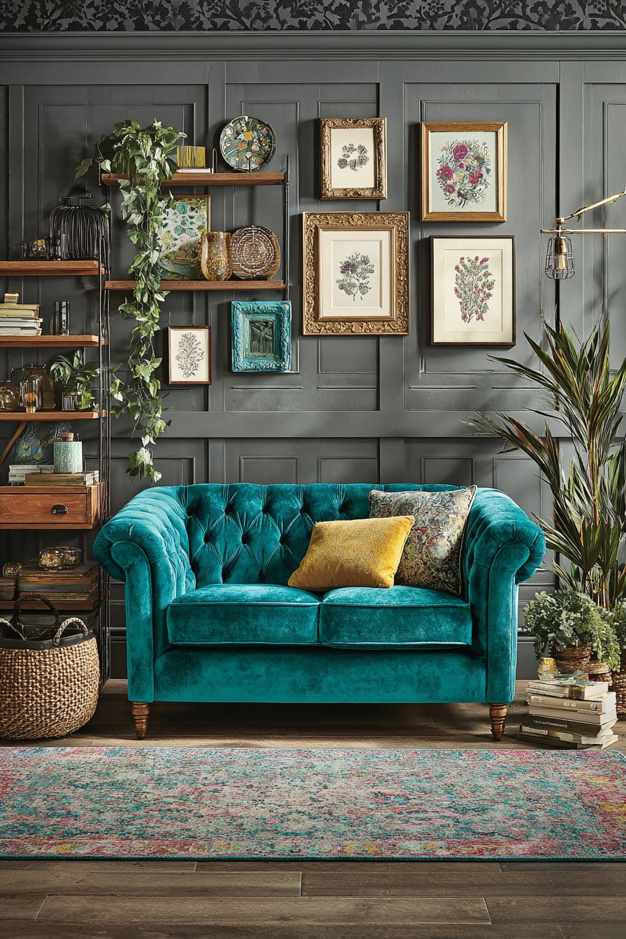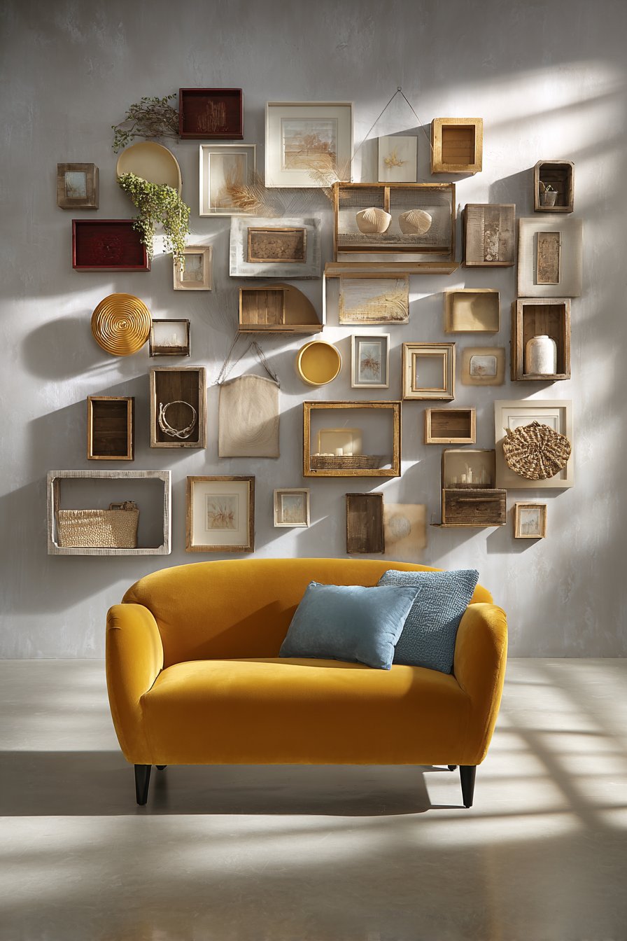 The velvet loveseat in jewel tones positioned below feels appropriately opulent for such a maximalist display. The rich color and luxurious texture of the furniture match the abundance and layering of the wall above. Layered lighting from multiple sources—natural window light, directed spotlights, ambient overhead lighting—creates dramatic shadows and highlights that change throughout the day, revealing different aspects of the three-dimensional elements at different times.