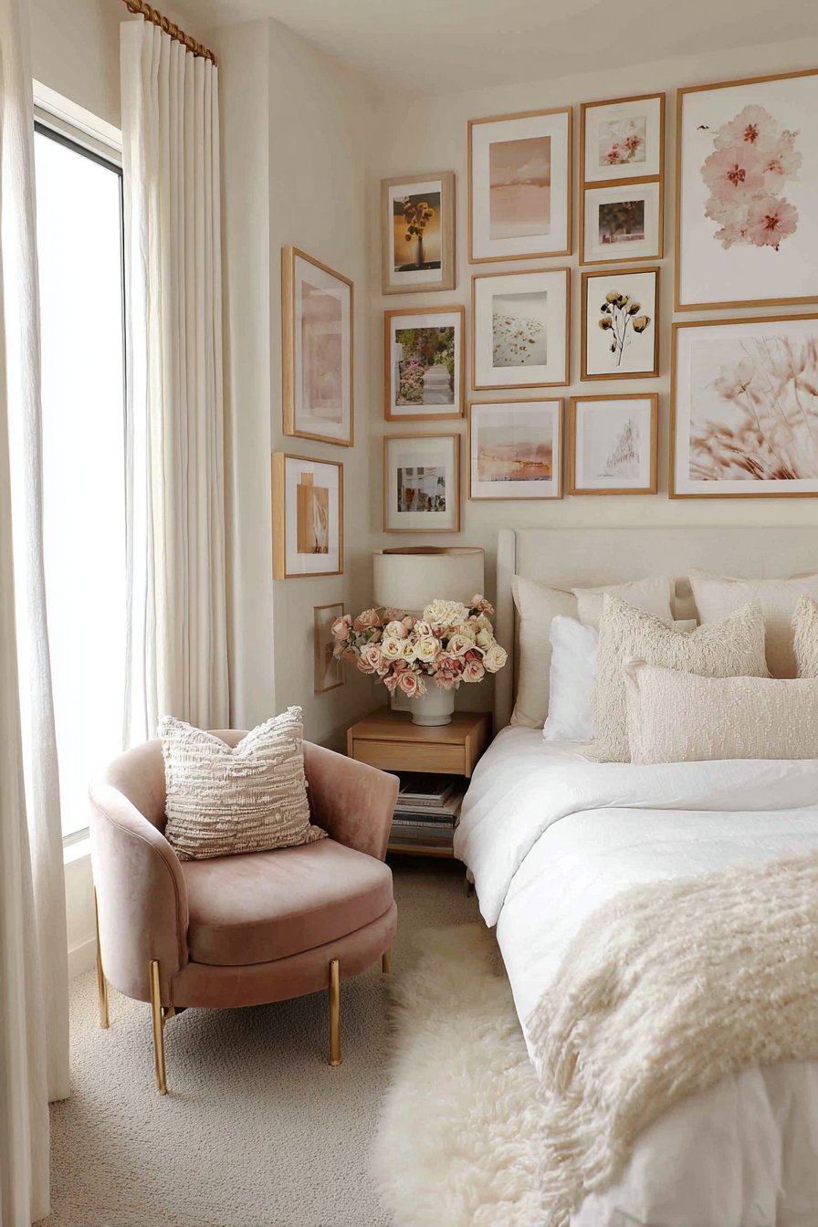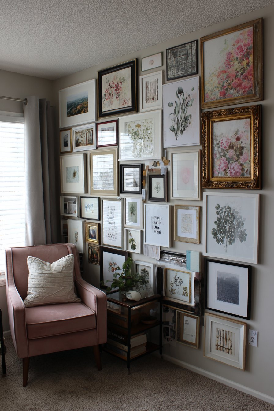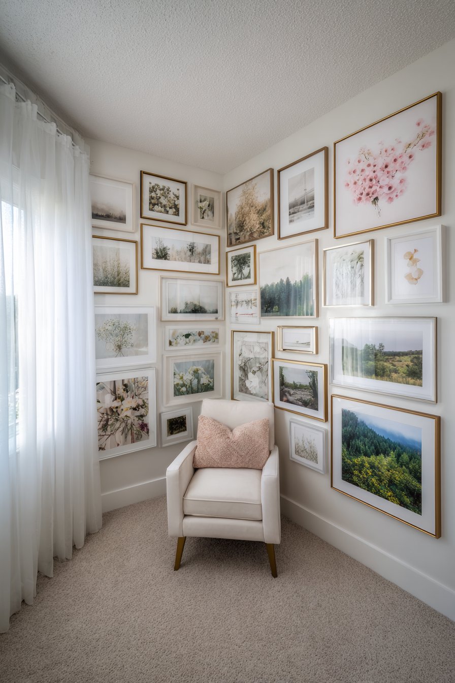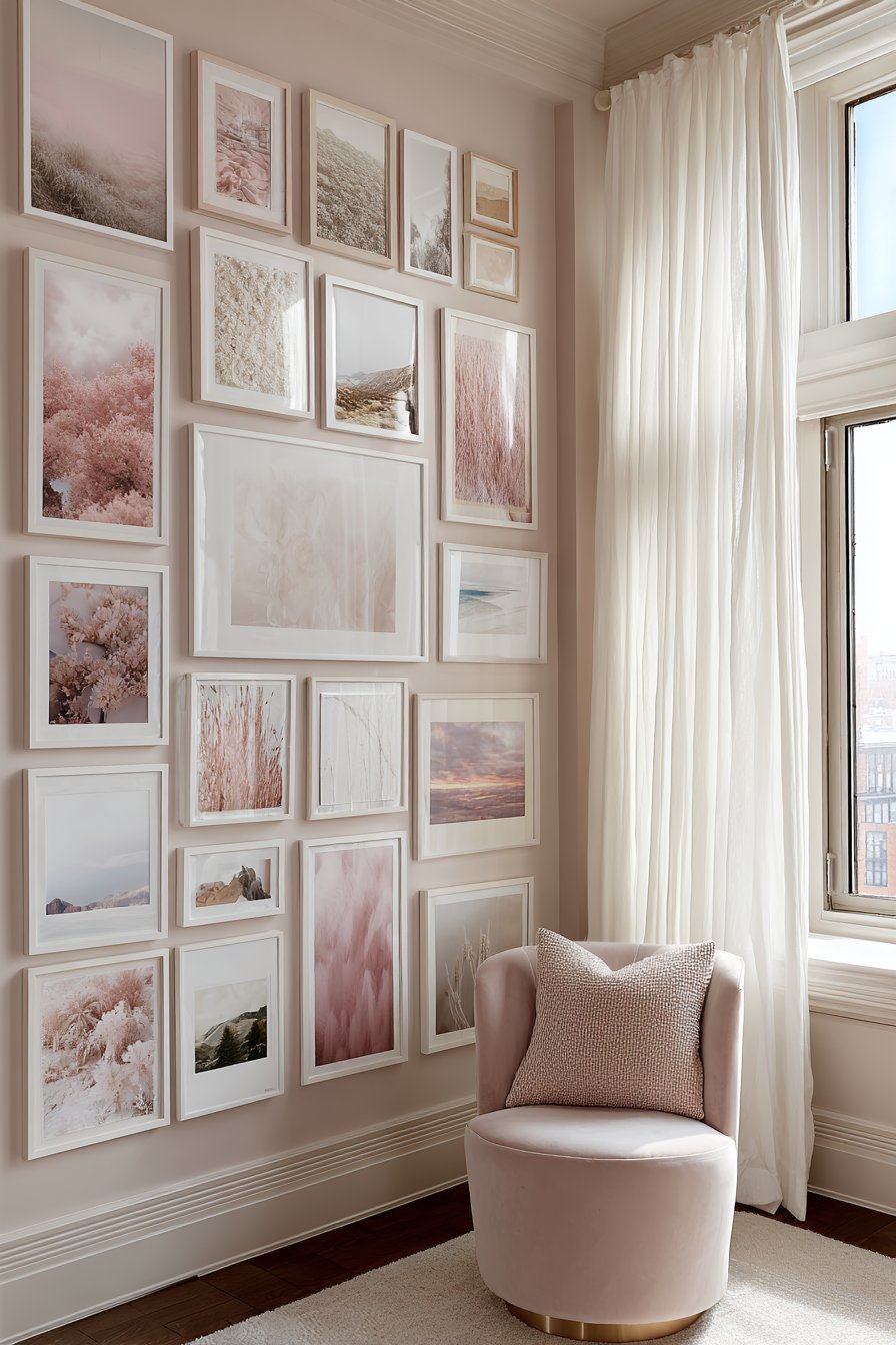 The integration of a plush reading nook with a velvet chair positioned below the display creates a functional relationship between the art and the living space. The chair placement invites inhabitants to settle in and contemplate the images surrounding them, transforming passive wall decoration into an interactive experience. Soft morning light filtering through sheer curtains adds an ethereal quality to the pastel palette, while the varied frame finishes catch and reflect light differently, adding subtle visual interest even when viewing from a distance.