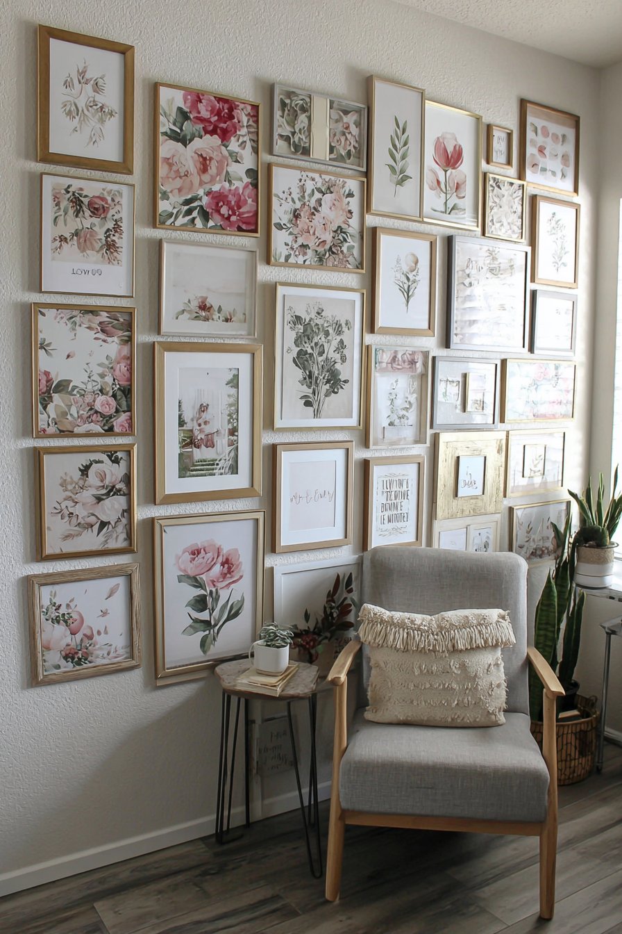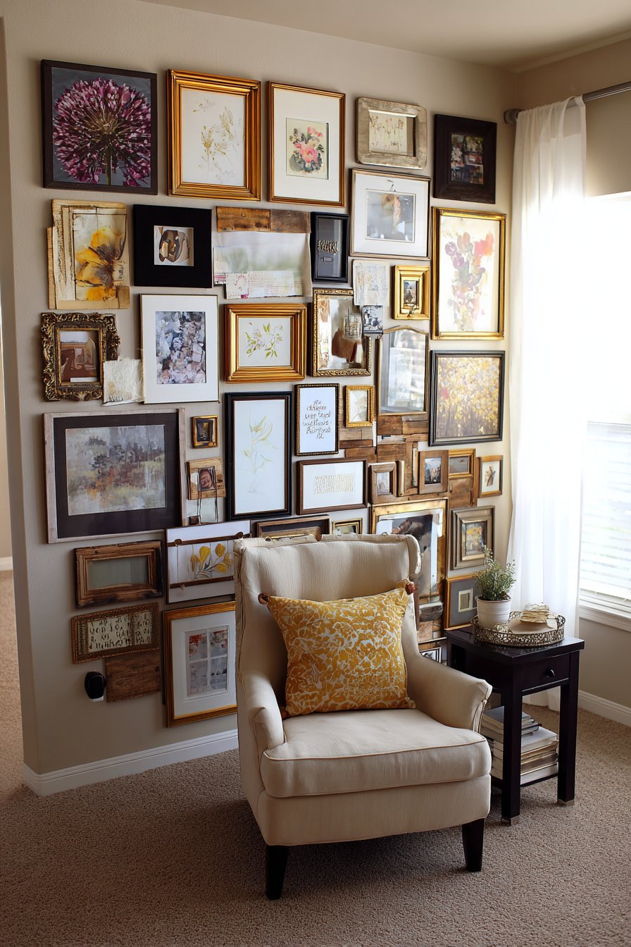 For those who embrace maximalism and the beauty of collected treasures, the salon-style gallery wall offers unparalleled opportunity for self-expression. This approach completely covers an accent wall in a home office with frames of every imaginable size—from tiny 4×6 inch pieces to substantial 20×24 inch statements—creating a rich tapestry of visual interest. The mixed materials spanning distressed wood, ornate gold, and simple black frames add textural variety that prevents the eye from becoming bored, while the diverse content including vintage botanical prints, family portraits, abstract watercolors, and inspirational quotes tells a complex story about the inhabitant’s interests and values.
