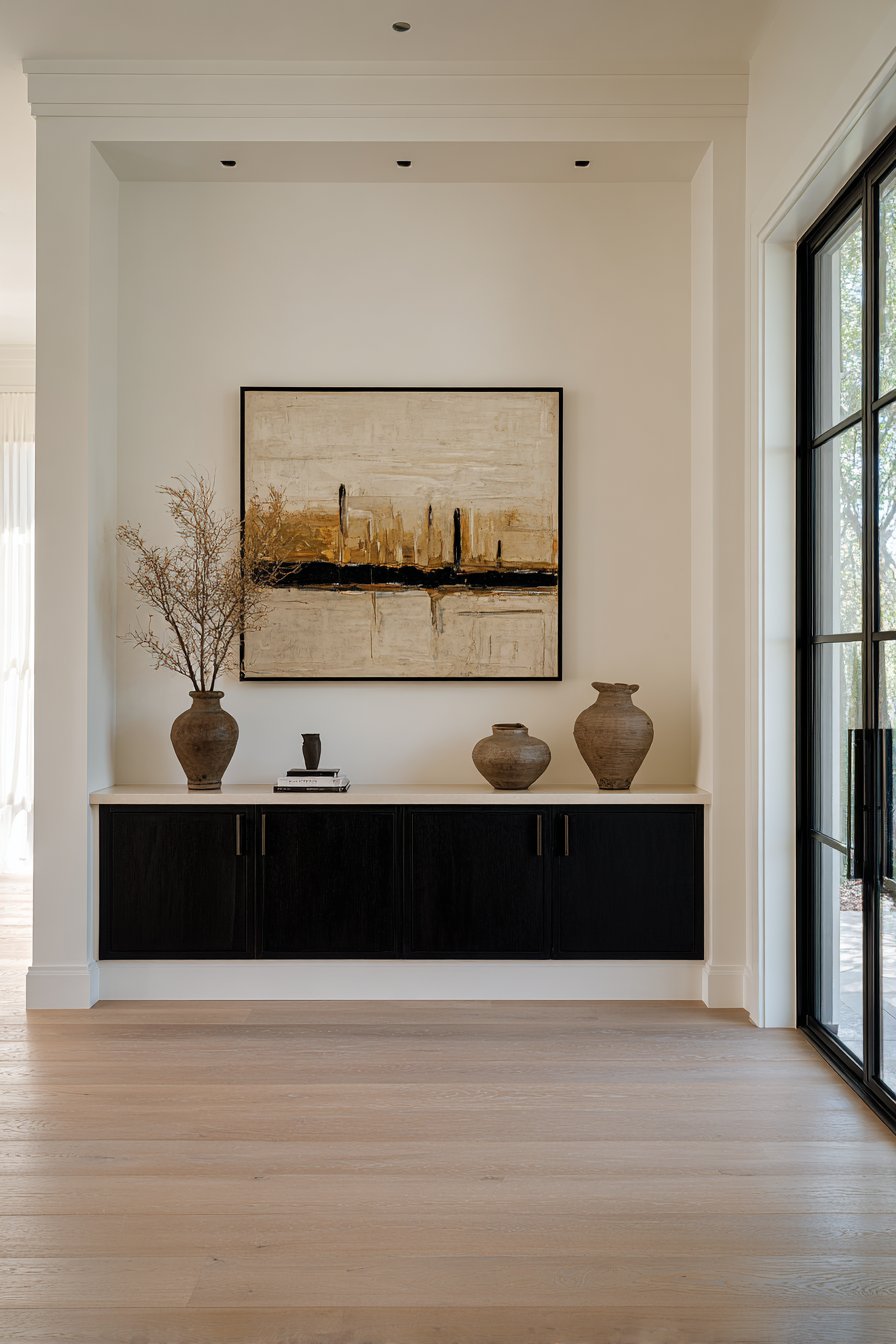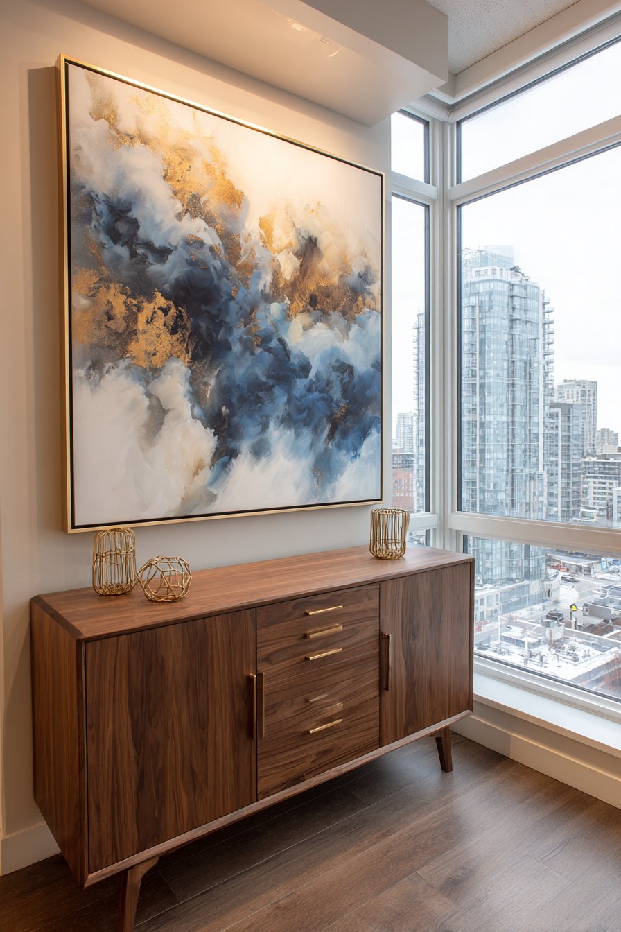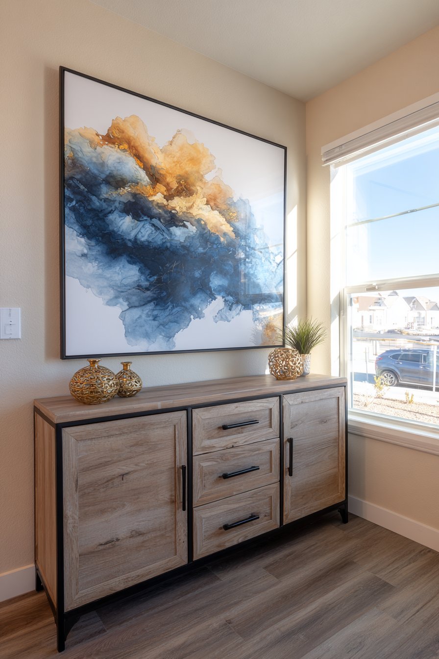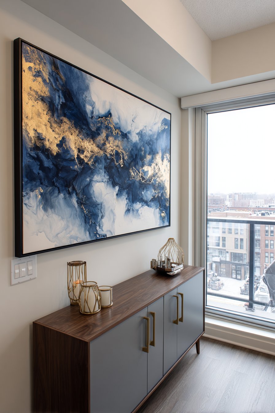 Sometimes the boldest choice is restraint, as proven by this minimalist approach featuring one oversized canvas above a modern dining buffet. The single 40×60 inch piece in a simple black floating frame contains a striking abstract painting with bold brushstrokes in navy and gold. Rather than filling the wall with numerous smaller pieces, this approach allows one carefully selected artwork to command complete attention. The singular focus creates dramatic impact without clutter, embodying the minimalist principle that one perfect element surpasses many mediocre ones.