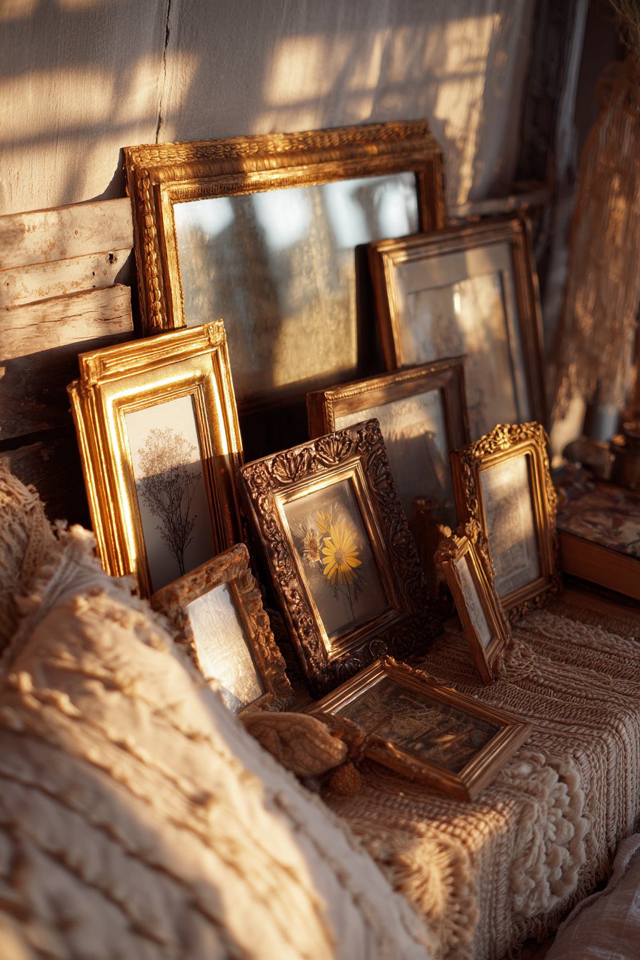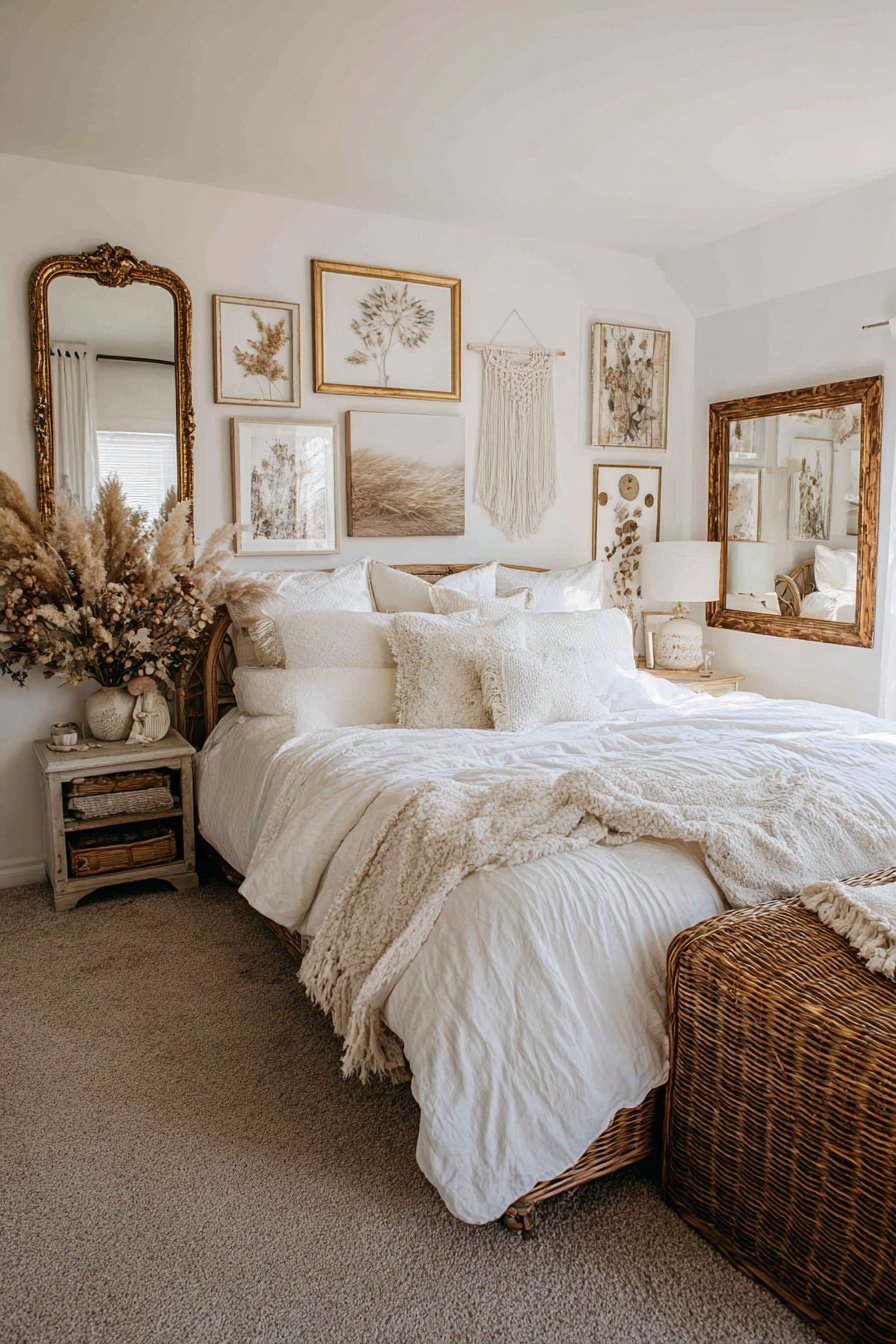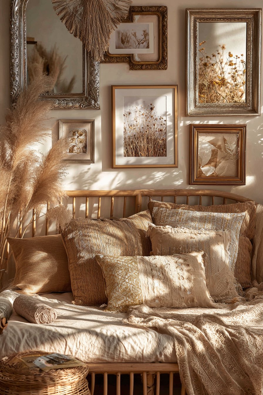 Blending functional mirrors with decorative frames creates unexpected dimension and light reflection in this bohemian bedroom display. Ornate vintage mirrors in various shapes and sizes intermingle with decorative frames containing pressed flowers, macramé art, and nature photography. The mixed finishes—distressed gold, antique silver, and weathered wood—feel collected over time at flea markets and estate sales rather than purchased as a coordinated set. The arrangement has an organic, evolved quality that perfectly suits bohemian design philosophy, which rejects matching sets in favor of personal curation.