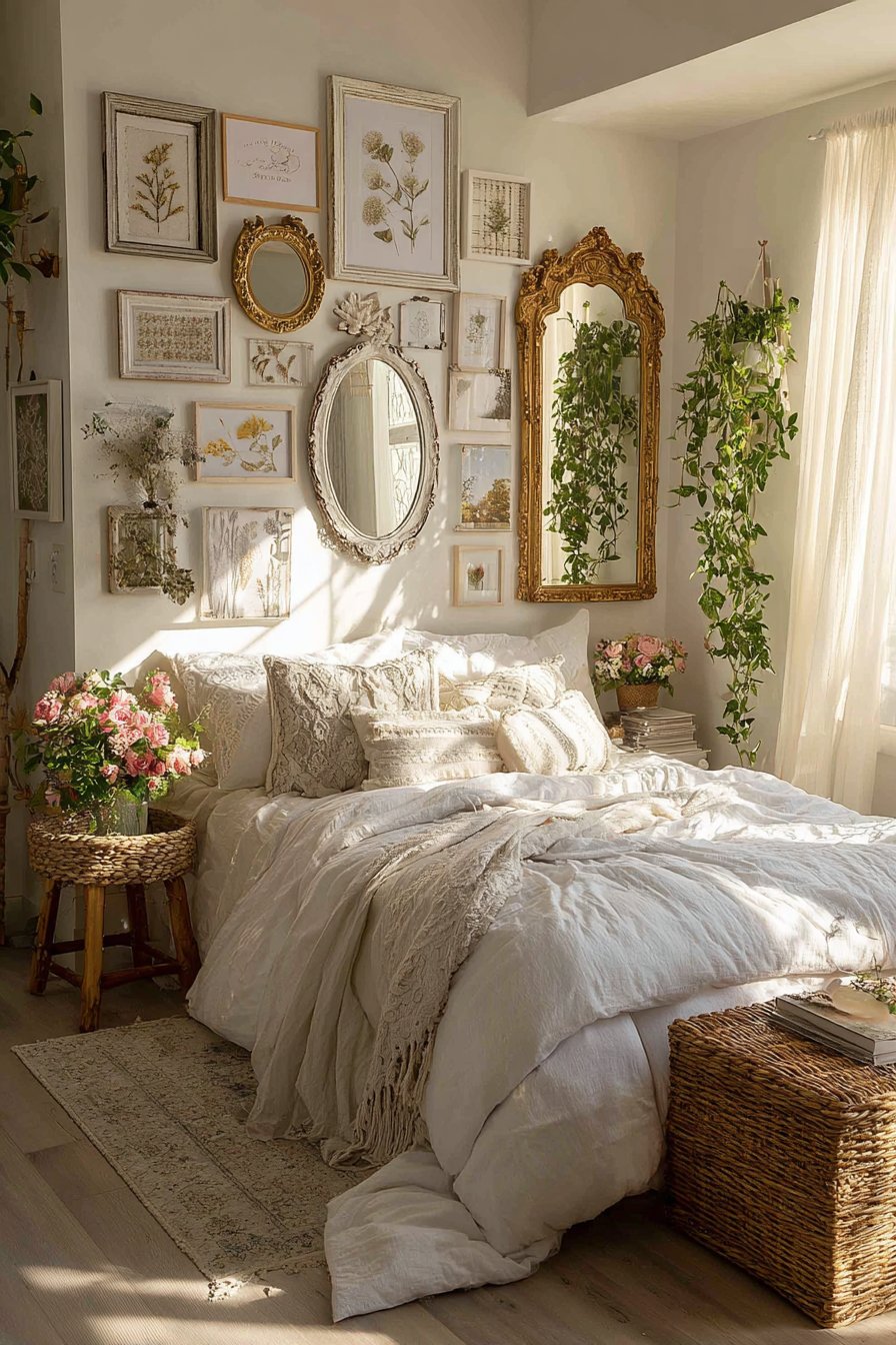 The rattan bed with textured linens positioned below continues the natural, bohemian aesthetic. The combination of woven rattan, soft fabrics, and the variety of materials in the frames and mirrors creates a tactile richness that invites touch and close examination. Soft natural light creates a dreamy, romantic atmosphere that complements the collected, personal nature of the display. The entire composition feels like a reflection of the inhabitant’s unique personality rather than a designer’s prescribed vision.