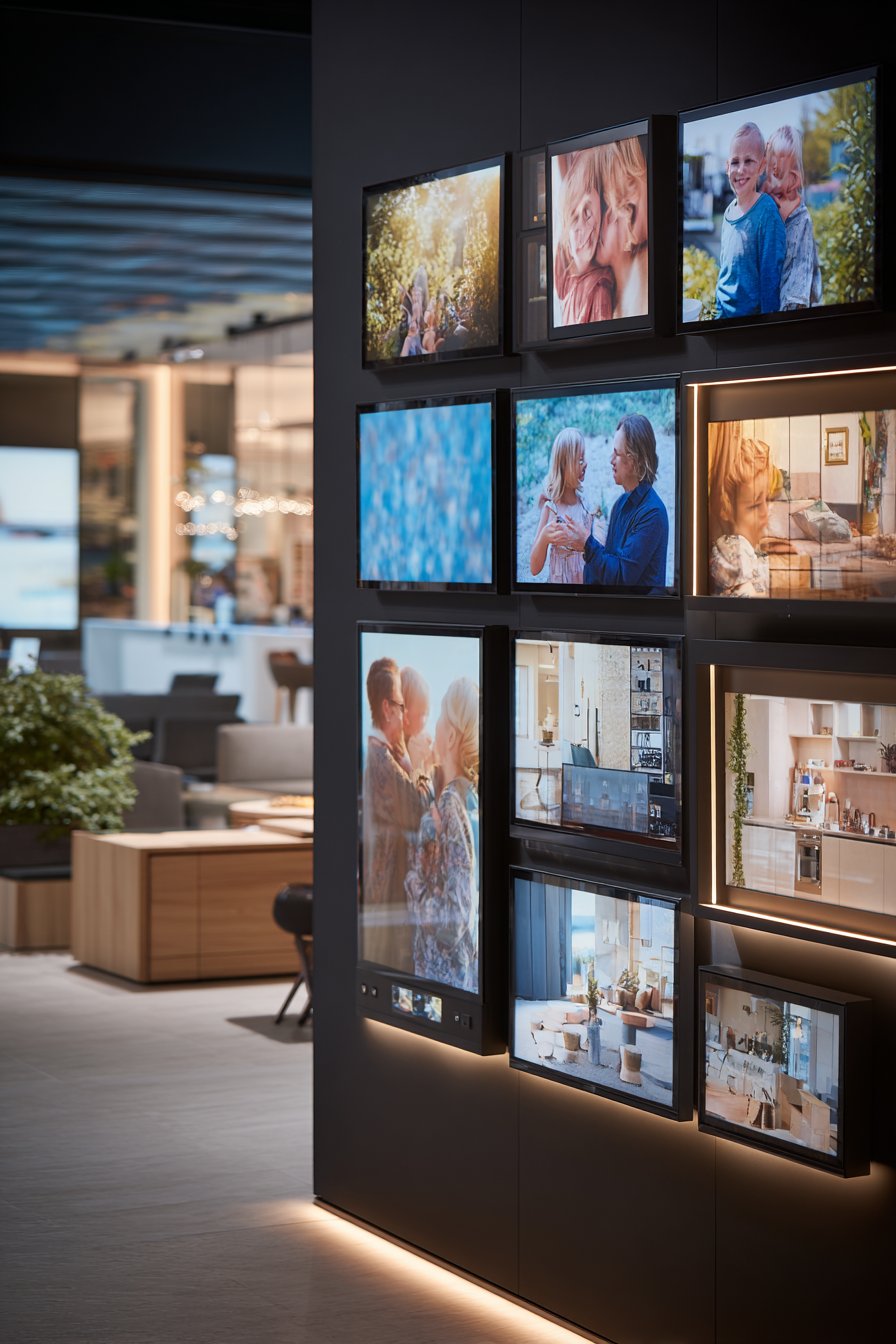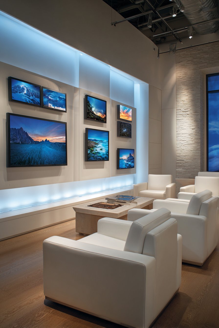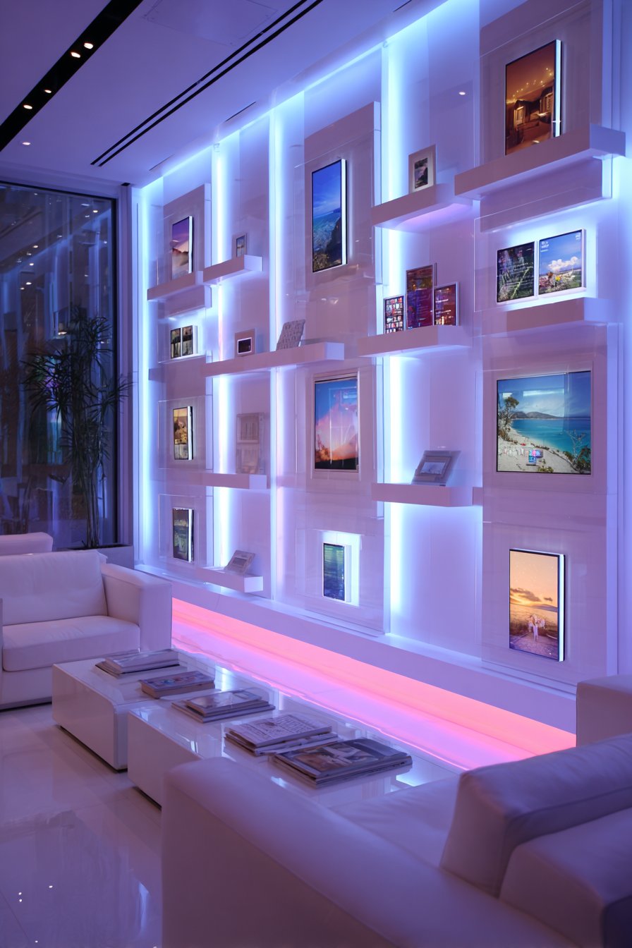 The contemporary furniture with clean lines positioned below reinforces the high-tech aesthetic. The built-in LED backlighting creates ambiance while ensuring the digital displays remain visible even in dim conditions. The even artificial lighting prevents the screen glare issues that often plague digital displays, creating a presentation quality that rivals traditional printed photographs. The entire installation feels futuristic yet warm, proving that technology and emotional content can coexist harmoniously.
