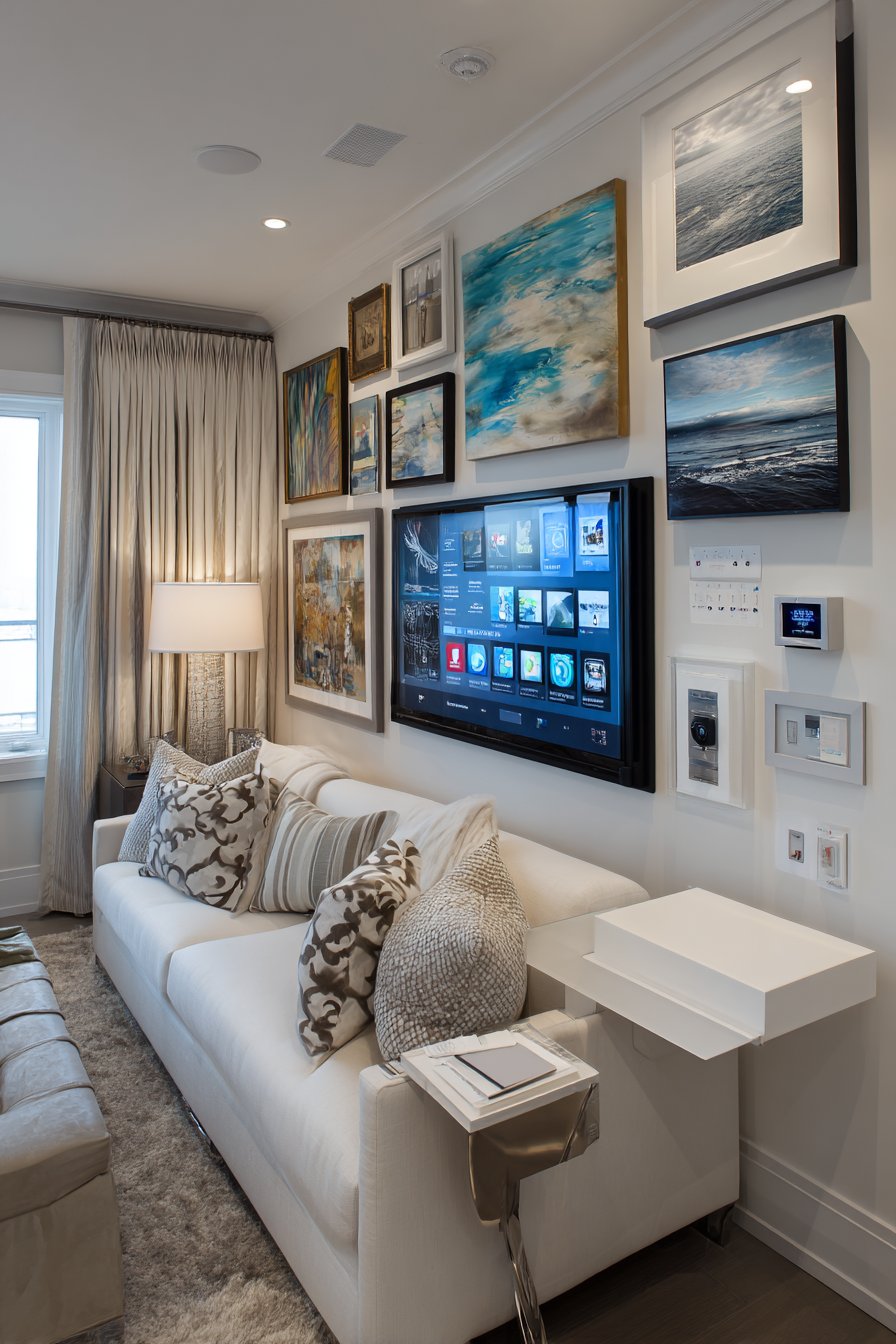Key Design Tips: Invest in high-quality digital frames with excellent resolution—cheap screens undermine the entire concept. Create diverse content collections to take advantage of rotation capability—landscapes, family photos, abstract art, inspirational quotes. Set rotation times thoughtfully—3-5 minutes per image works well for ambient displays. Include physical frame elements around some digital screens to blend new technology with traditional aesthetics. Ensure smart controls are intuitive for all household members—complex systems don’t get used.