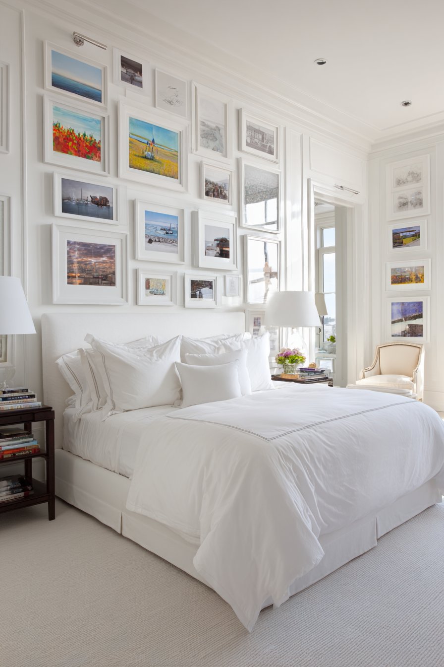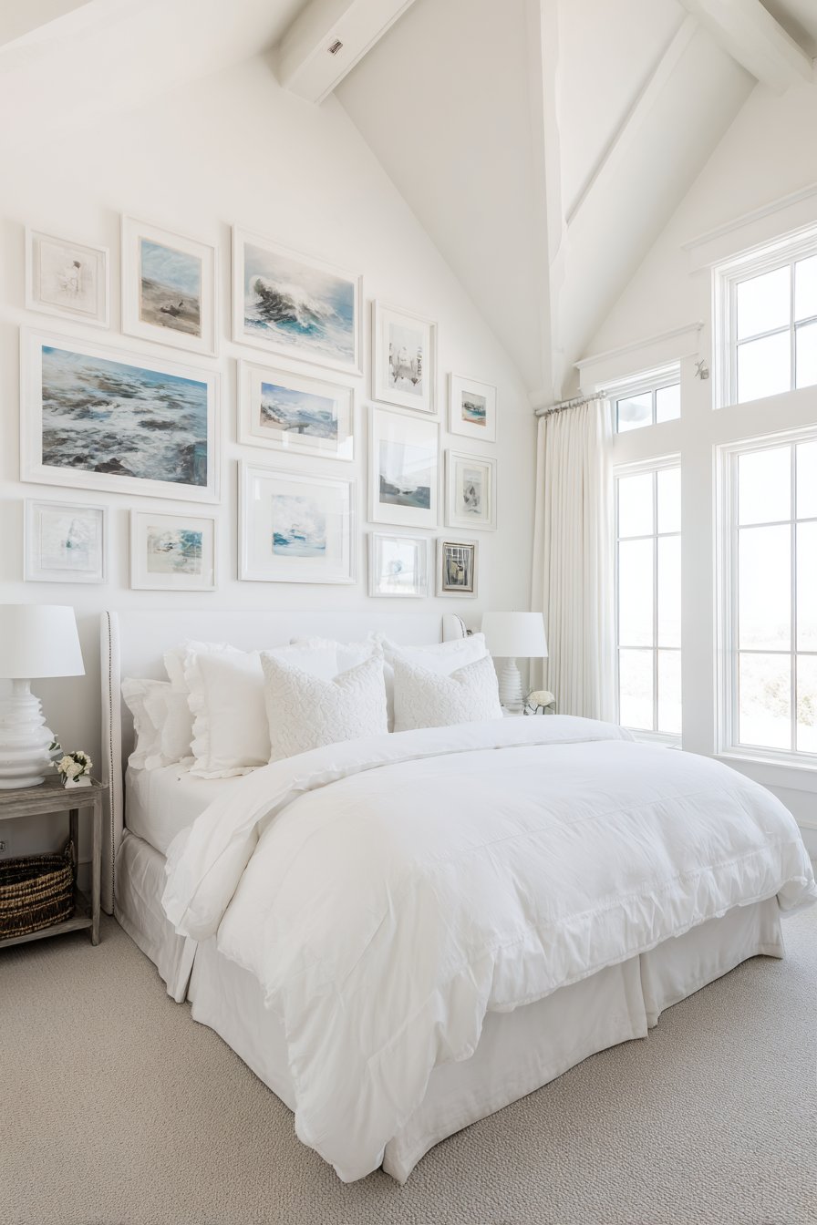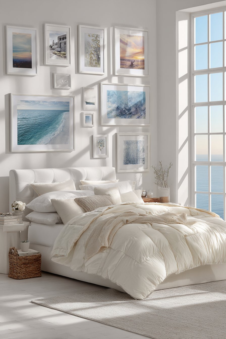 The white upholstered headboard and crisp white bedding continue the serene, monochromatic palette throughout the room. This tonal consistency creates a sophisticated, gallery-like atmosphere that feels spa-like and restorative. Abundant natural light flooding through windows emphasizes the fresh, clean aesthetic while revealing subtle texture variations in the white painted frame finishes. The lack of color allows attention to focus on form, composition, and the emotional content of the imagery.