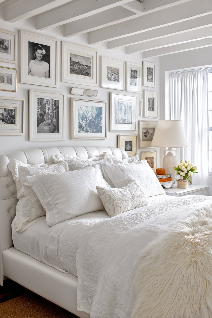 Key Design Tips: Use exclusively white frames but vary sizes to maintain visual interest. Include diverse content—the white frames will unify even disparate imagery. Vary frame styles slightly—some with simple profiles, some with wider moldings—to prevent excessive uniformity. Space frames consistently, typically 2-3 inches apart, using a level to maintain straight alignments. Consider cream or warm white frames rather than pure white if your walls are bright white to create subtle definition.