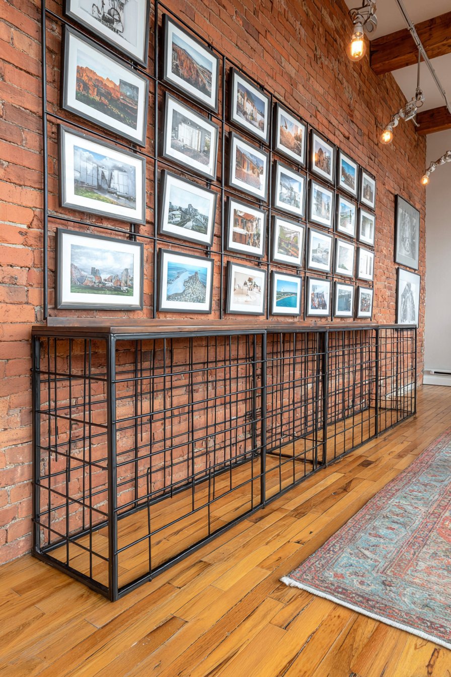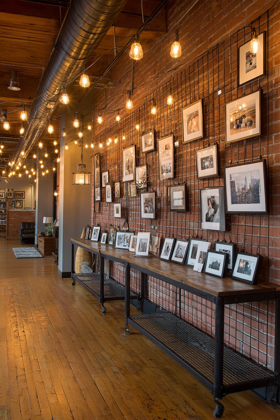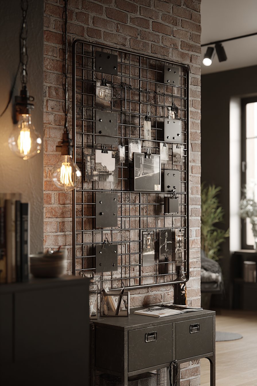 Urban loft aesthetics inform this industrial-style gallery wall utilizing metal frames and clip systems. Black metal grid panels mount directly on exposed brick, providing a flexible framework where photos attach with industrial clips rather than being permanently framed. This modular system allows instant rearrangement—clip photos on and off as mood strikes, rotate seasonally, or completely redesign the layout in minutes. Additional photos lean casually against the wall on a metal console table below, reinforcing the relaxed, utilitarian approach.