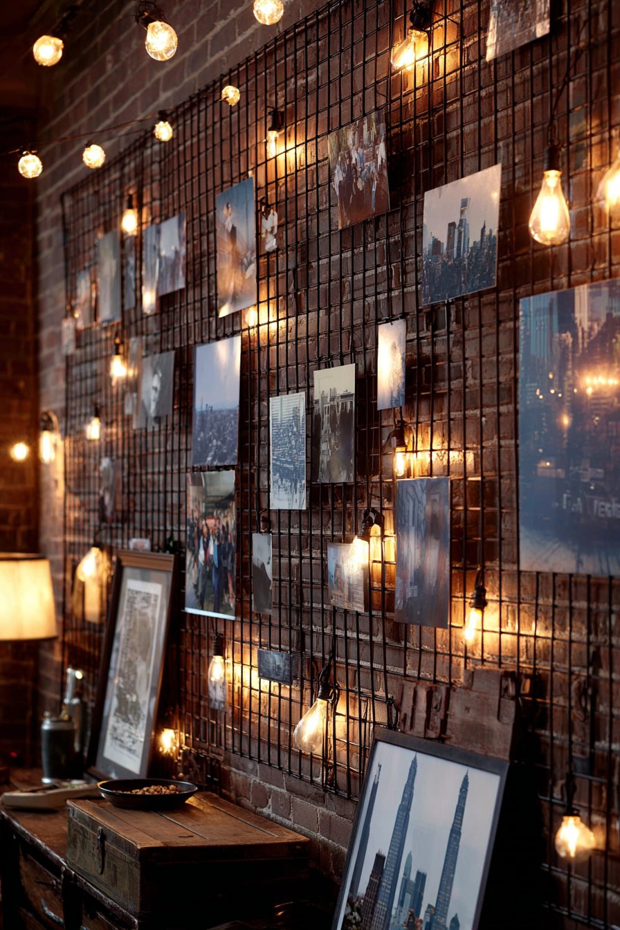 Edison bulb string lights provide warm ambient lighting that softens the hard-edged industrial materials. The warm glow contrasts beautifully with the cool metal and masonry, creating atmospheric lighting particularly appealing in evening hours. The metal console table below offers additional display surface while maintaining material consistency with the grid system above. The entire installation feels authentic to industrial design principles rather than merely decorative mimicry.