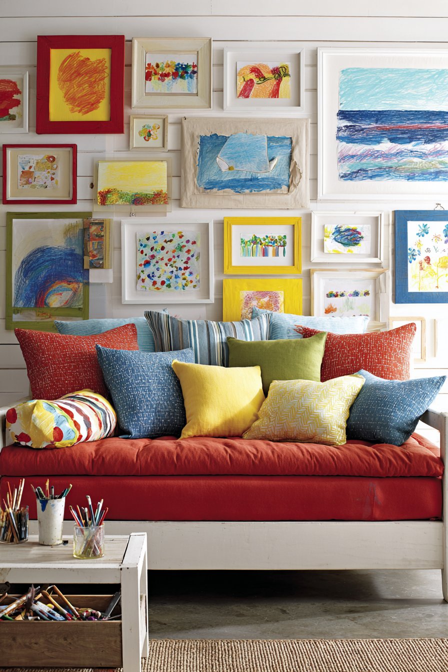 Family-friendly functionality meets design sophistication in this children’s art showcase wall. Simple, inexpensive frames in primary colors—red, yellow, blue, and green—display children’s paintings and drawings in a cheerful, rotating gallery. The strategic placement at child height allows young artists to independently swap out artwork as they create new pieces, fostering ownership and pride in their creations. The bright frame colors coordinate with typical playroom or family room palettes while the simple frame construction keeps costs low for frequently changed content.