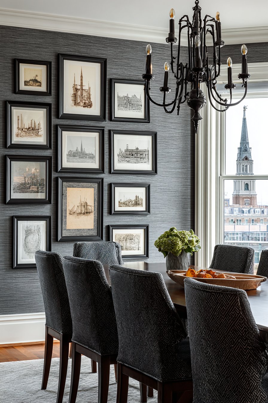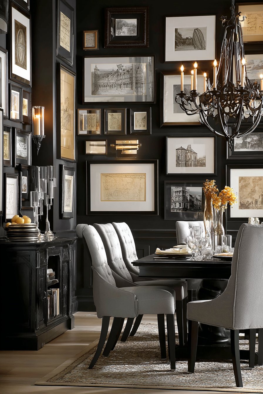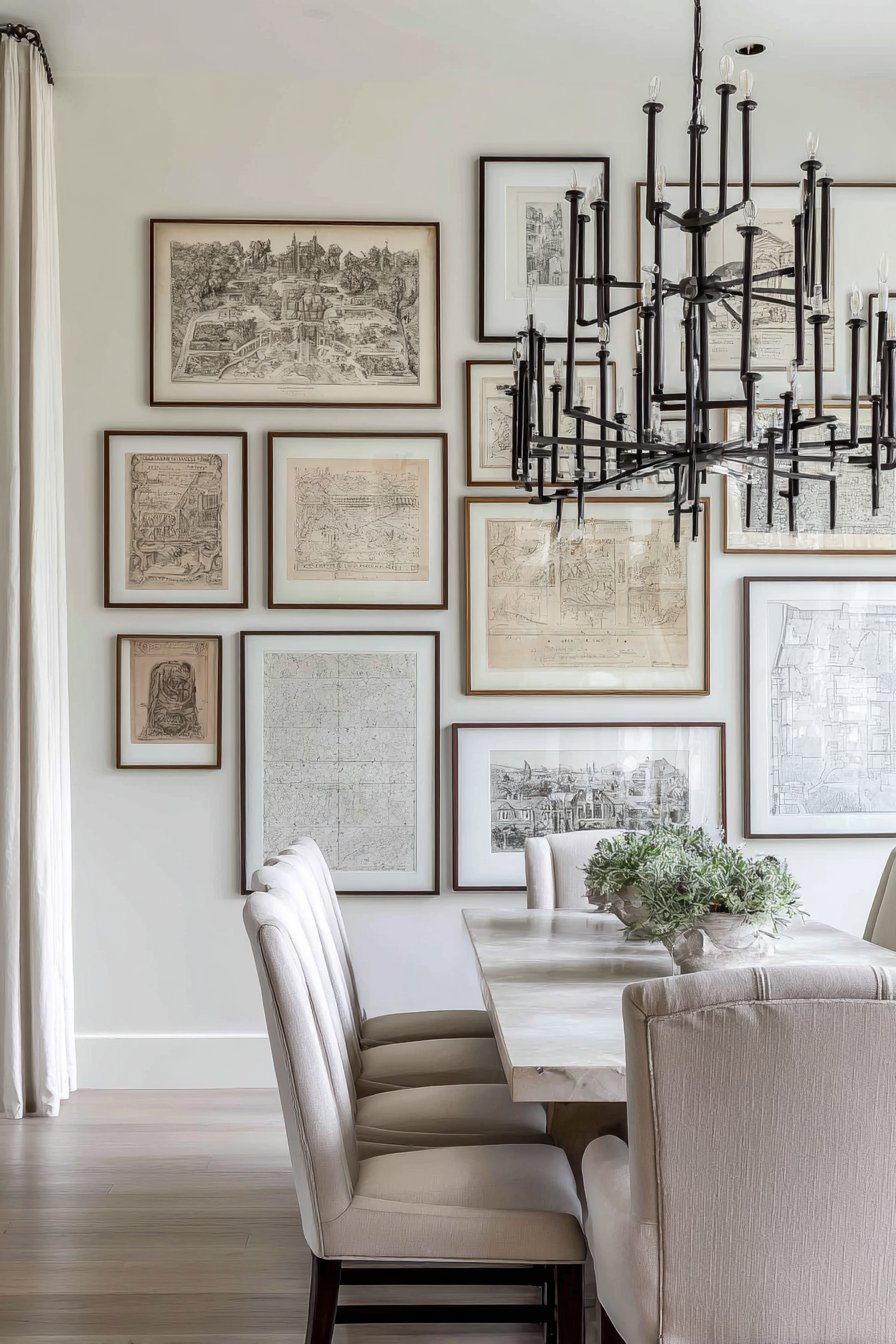 Gallery-quality presentation transforms this formal dining room display into a sophisticated salon wall. Various-sized frames in matching black lacquer finish feature professional matting with widths varying from 2 to 4 inches depending on the artwork size and proportion. The collection includes fine art prints, architectural drawings, and vintage maps, all unified through the consistent black frames and cream-colored matting. The balanced asymmetrical arrangement follows classical salon wall principles where variety within consistency creates visual richness without chaos.