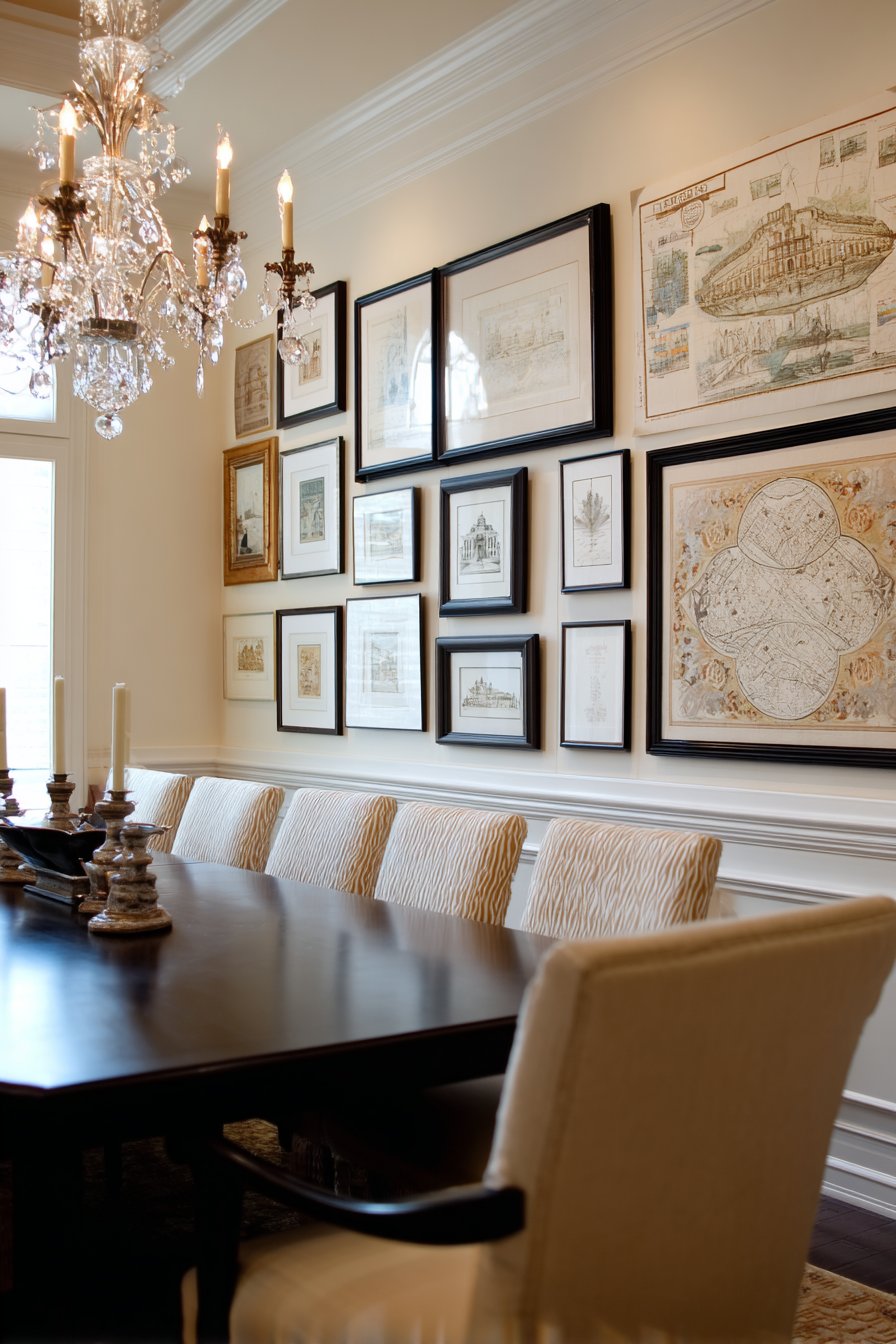 The elegant dining table with upholstered chairs positioned below reinforces the formal, sophisticated aesthetic. Chandelier lighting provides refined illumination that highlights the professional quality of the framing and matting. The entire composition communicates attention to detail and appreciation for proper art presentation, creating an environment suitable for formal entertaining or intimate family dinners where the surroundings enhance the experience.