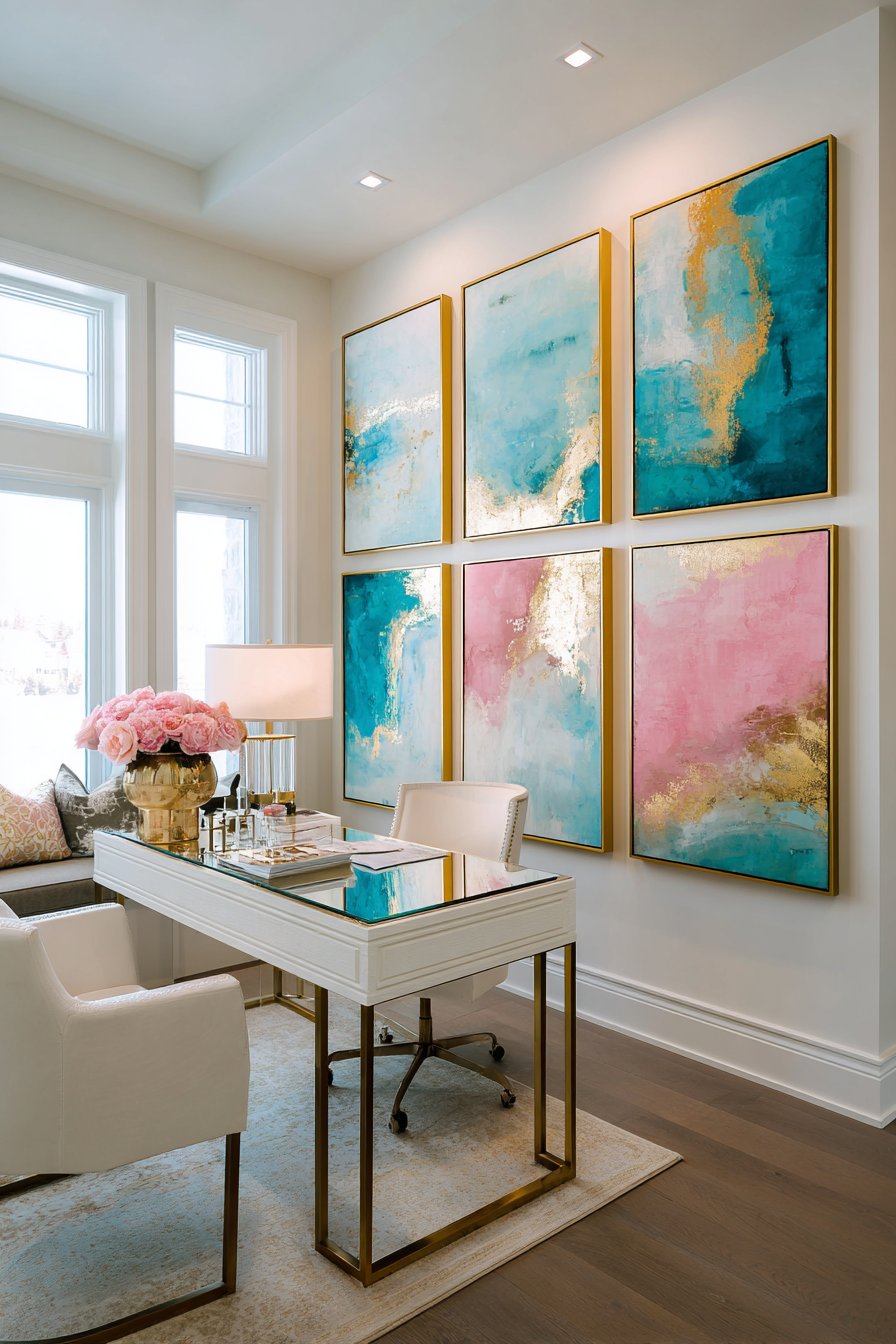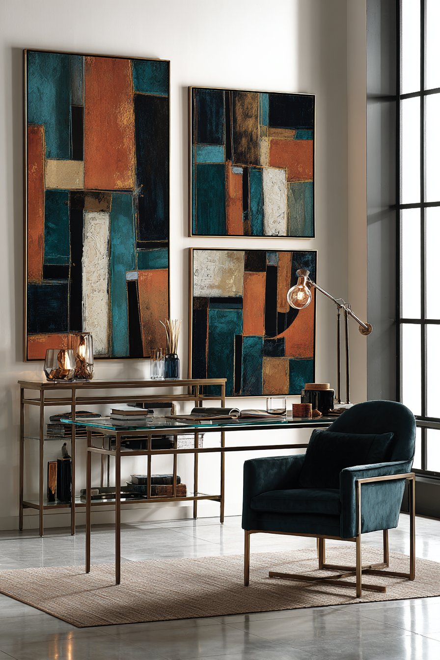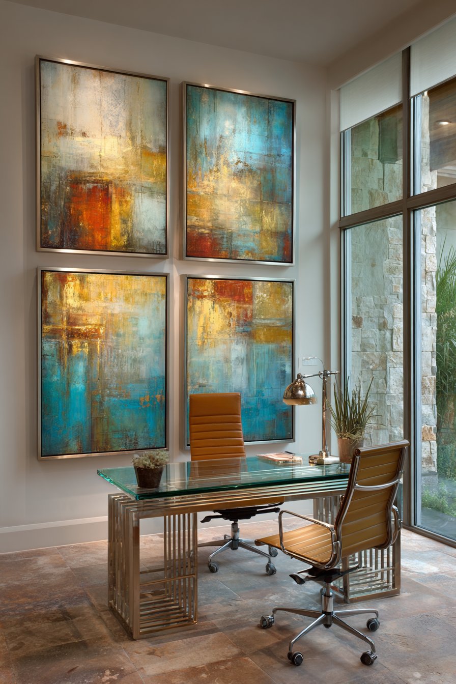 Artistic sophistication takes center stage in this contemporary home office featuring large-scale abstract paintings. Four substantial pieces measuring 24×36 inches each are mounted in thin metallic frames and arranged in a 2×2 grid. The abstract paintings coordinate through shared color palette—teal, coral, and gold—with bold geometric shapes and dynamic compositions that energize the workspace. The thin frame profiles feel modern and understated, allowing the artwork itself to dominate without competition from ornate framing.