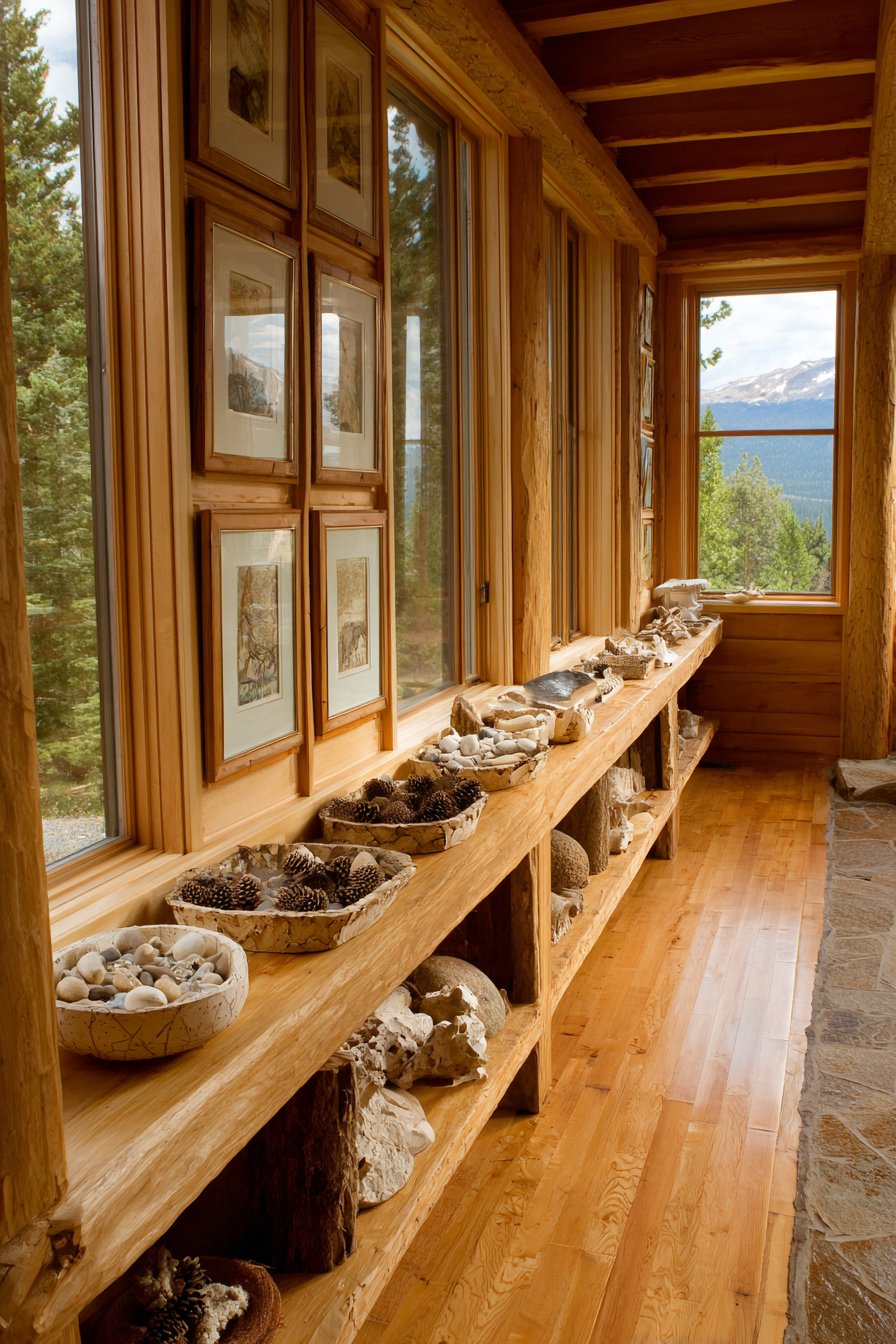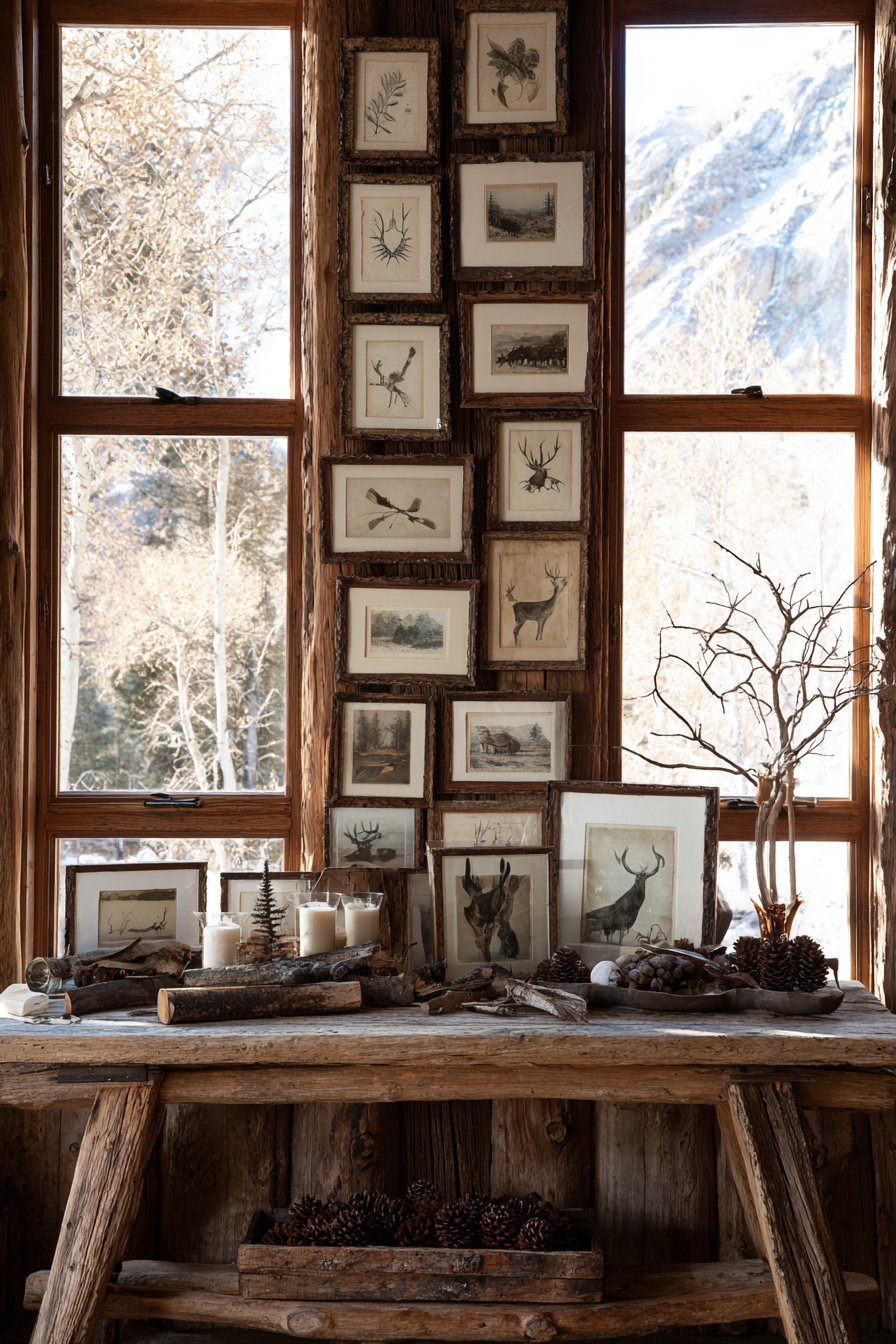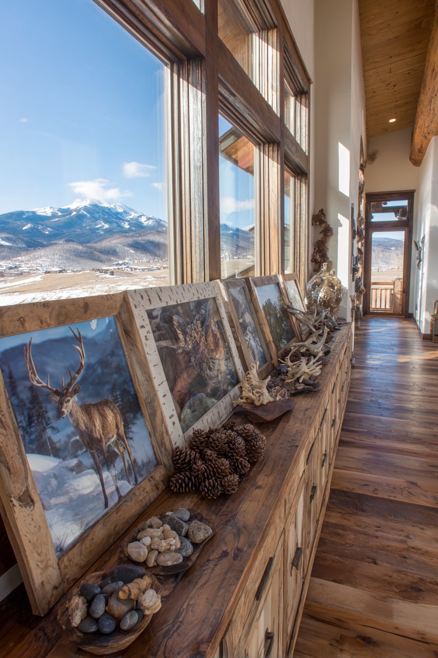 Large windows framing mountain views beyond create extraordinary connection between indoor gallery and outdoor reality. The wall display essentially serves as transition between interior space and exterior landscape, celebrating the natural beauty visible just beyond the glass. Natural light creates warm, earthy tones throughout the display, while the varied frame materials catch and reflect light differently, adding subtle texture and depth. The entire space feels like a nature sanctuary that honors rather than dominates the surrounding environment.