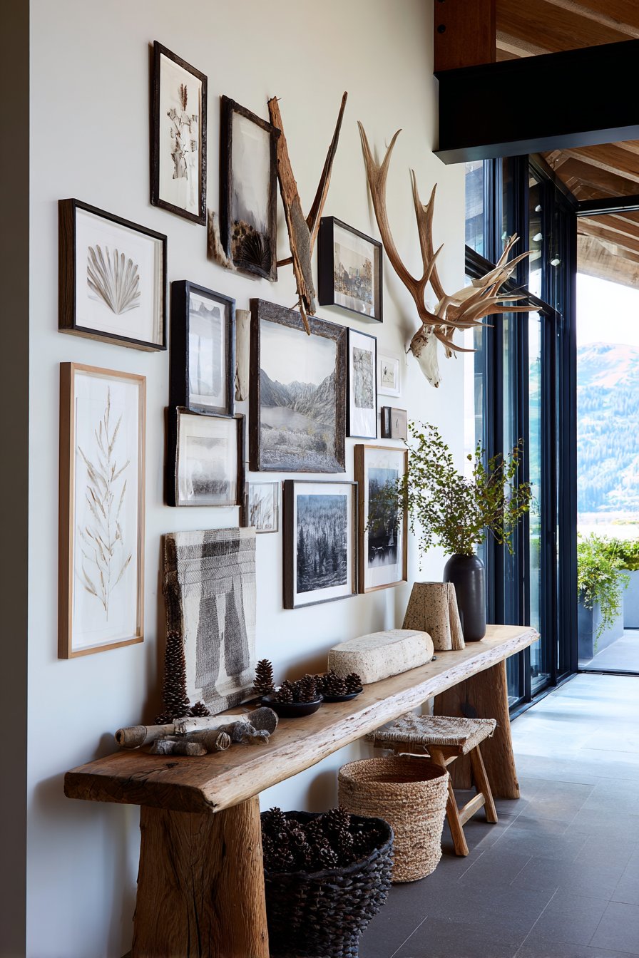 Organic materials and nature themes unite in this mountain cabin picture wall above a console table. Frames crafted from natural wood, birch bark, and even antler finishes display wildlife photography, forest landscapes, and botanical illustrations that celebrate the surrounding natural environment. The arrangement itself echoes natural patterns—not rigid grids but organic clustering that mimics how elements appear in nature. The rustic wooden console below holds additional nature elements like pinecones, river stones, and pieces of driftwood, creating seamless connection between the wall display and the three-dimensional space.