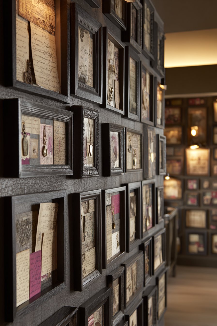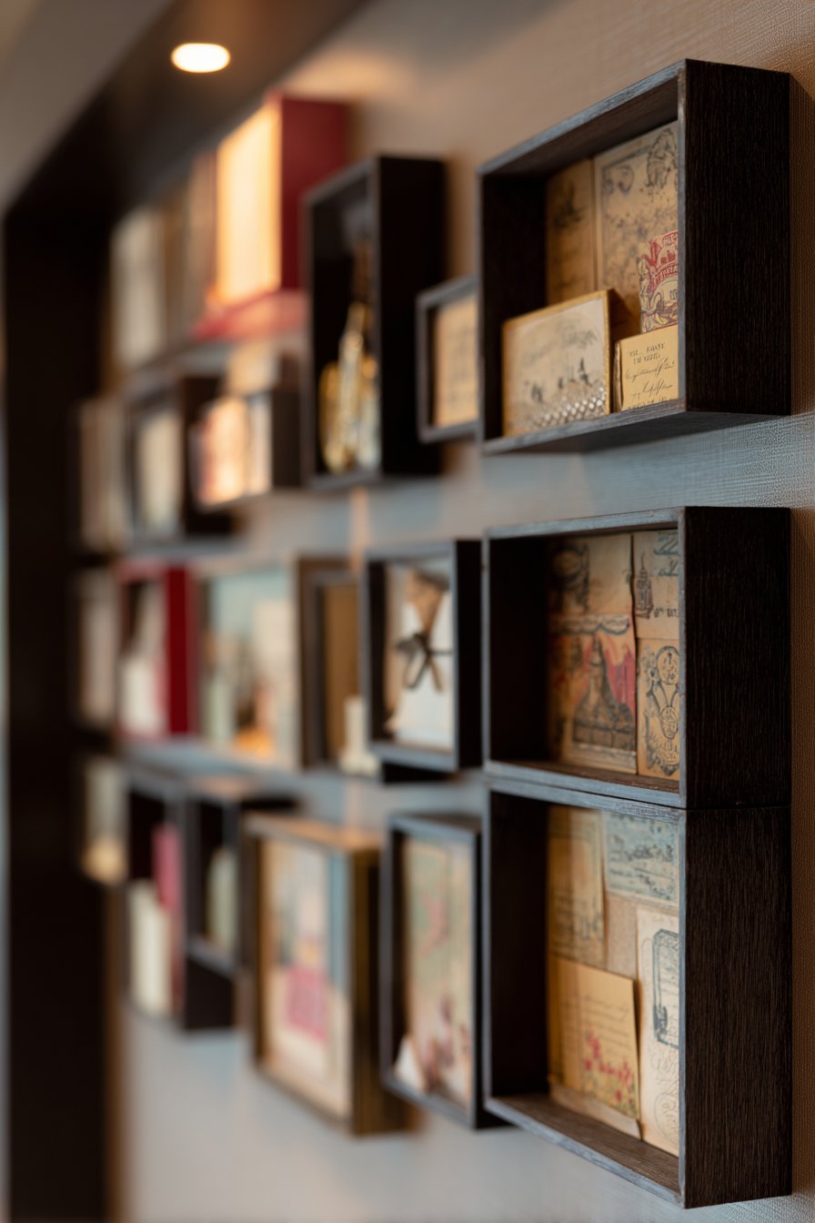 Key Design Tips: Purchase shadow boxes with adequate depth for your objects—typically 1.5-3 inches depending on what you’re displaying. Use acid-free backing and materials to prevent deterioration of sensitive items like paper and fabric. Arrange objects within each box thoughtfully—create mini-compositions rather than randomly placing items. Mix shadow boxes with some traditional flat frames to prevent the arrangement from feeling too busy. Include small labels or plaques identifying what events or periods the boxes commemorate.
