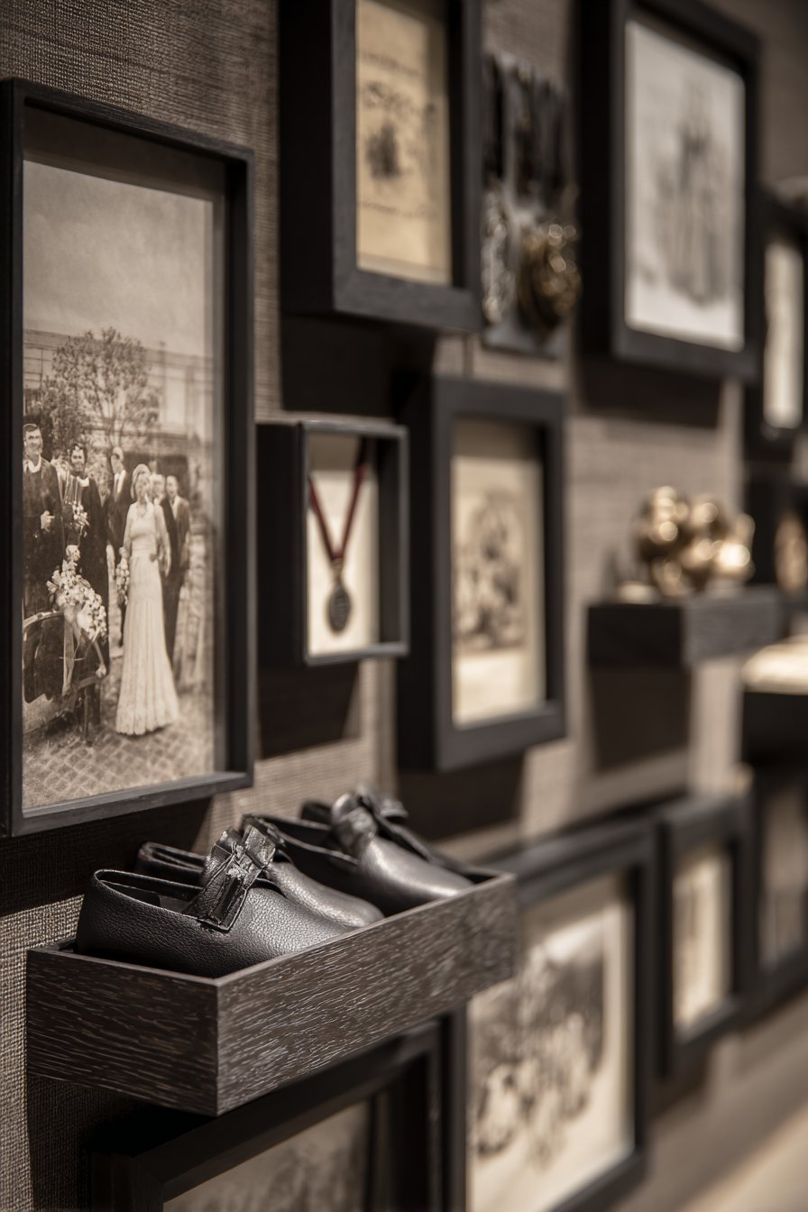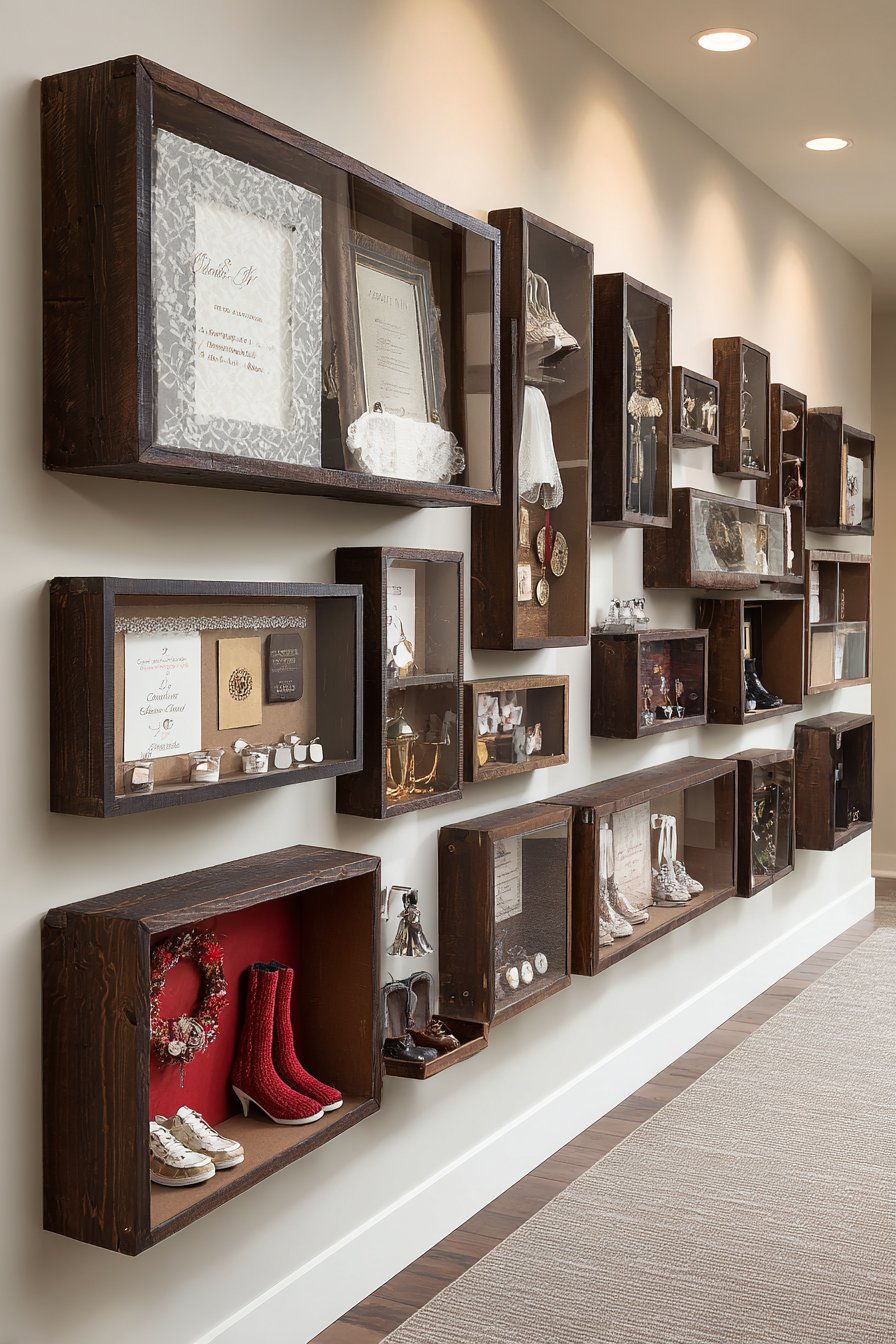 The hallway location ensures family members encounter these memory displays multiple times daily, keeping significant life events and achievements present in everyday consciousness. Soft hallway lighting creates intimate viewing conditions that encourage pausing and remembering, transforming a purely functional transit space into meaningful personal museum. The arrangement invites storytelling—as family members pass by, they might point out specific boxes and share the stories behind the displayed items.