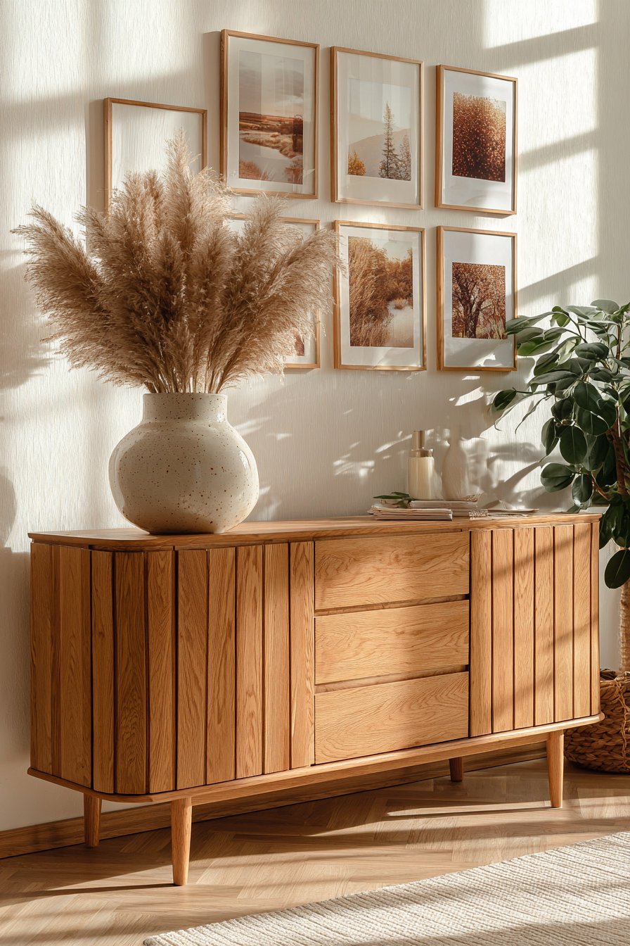 The strategic placement above a mid-century credenza creates a cohesive design moment that exemplifies how furniture and wall art should work in harmony. The addition of a ceramic vase holding dried pampas grass on the credenza surface introduces vertical interest and natural texture without disrupting the strong horizontal lines established by the frames above. Natural light from nearby windows washes across the arrangement evenly, eliminating hot spots and ensuring balanced illumination that changes subtly as the day progresses.