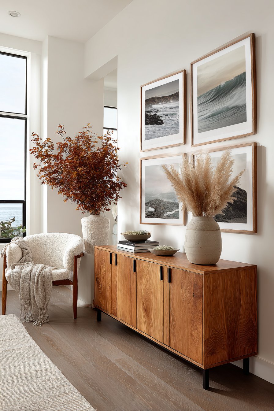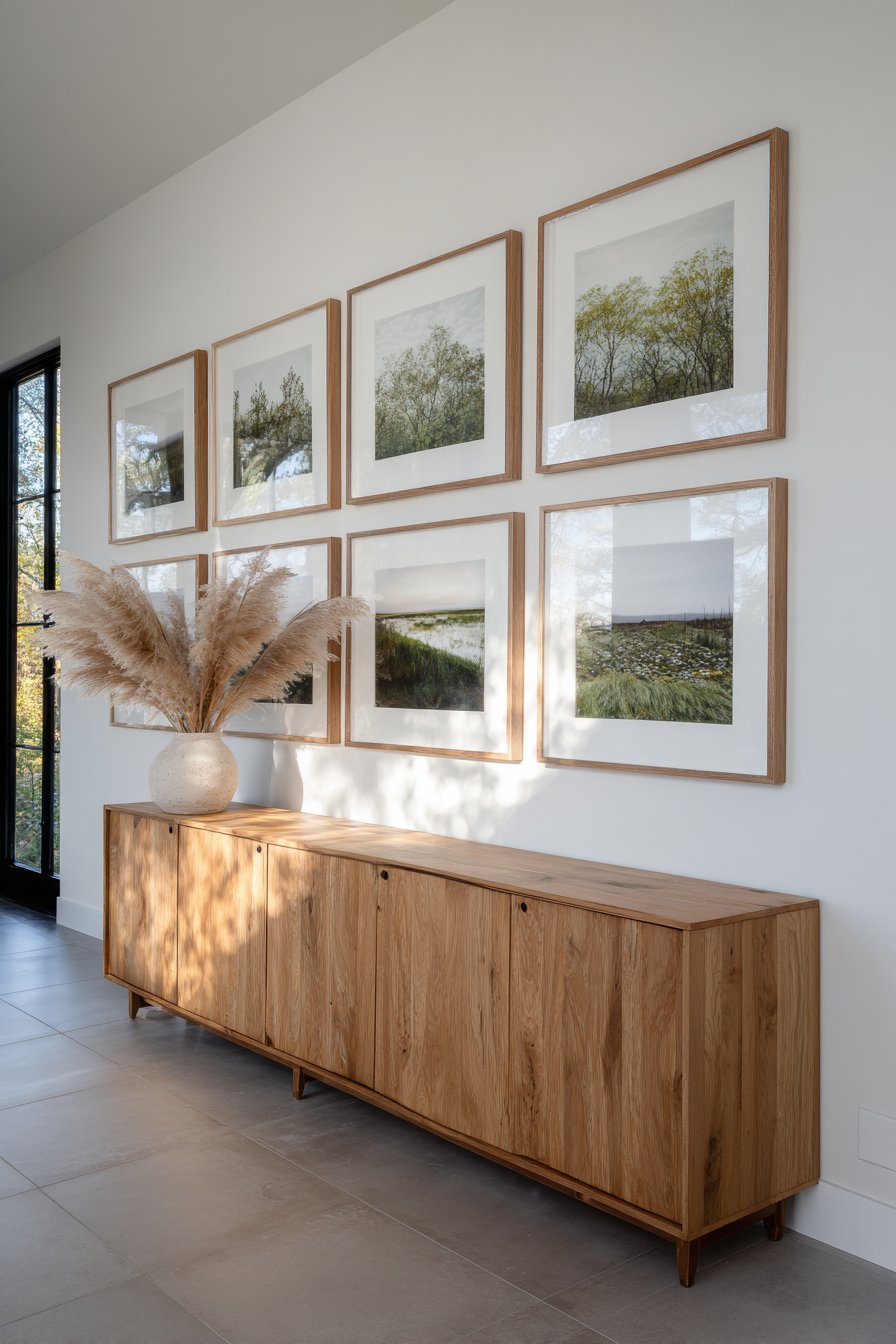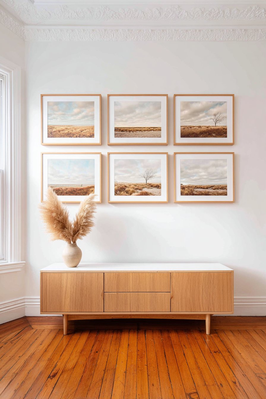 Clean lines and horizontal emphasis define this sophisticated approach to picture wall design. Five large-format frames, each measuring 20×30 inches and finished in natural oak, are positioned in a perfectly straight line above a mid-century modern credenza. The landscape photography within each frame showcases earthy tones—ochre, terracotta, sage, and burnt umber—that complement the warm wood tones of both the frames and the furniture below. This horizontal arrangement naturally draws the eye across the wall, creating a sense of movement and expansion that can make rooms feel wider than their actual dimensions.