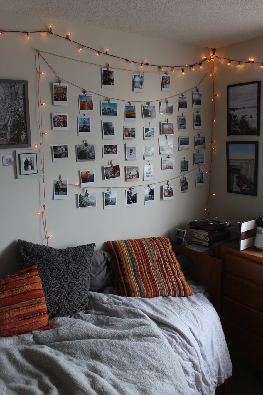 The low-commitment nature of this approach appeals to renters, students, or anyone hesitant to commit to permanent wall installations. The string and clips cause minimal wall damage compared to nails or picture hangers, while the flexibility allows complete redesign in minutes. The instant photo format feels authentic to teenage experience—capturing casual moments with friends rather than formal portraits, documenting everyday life rather than special occasions. The accumulation of photos over time creates visual diary documenting growth and change.