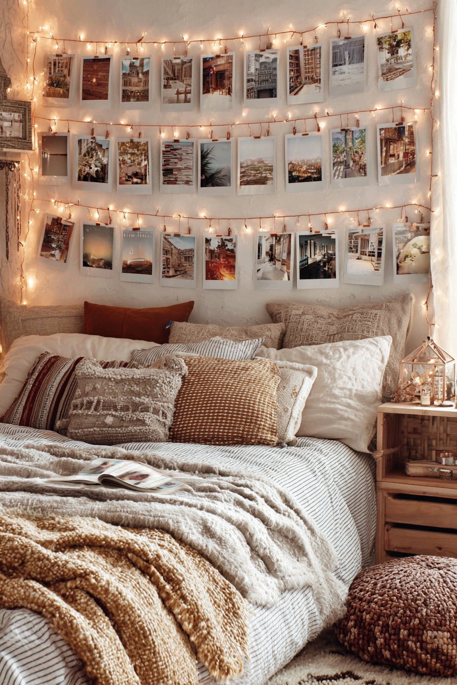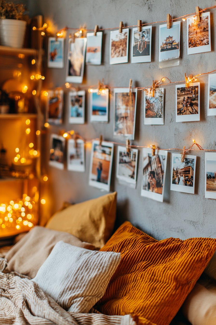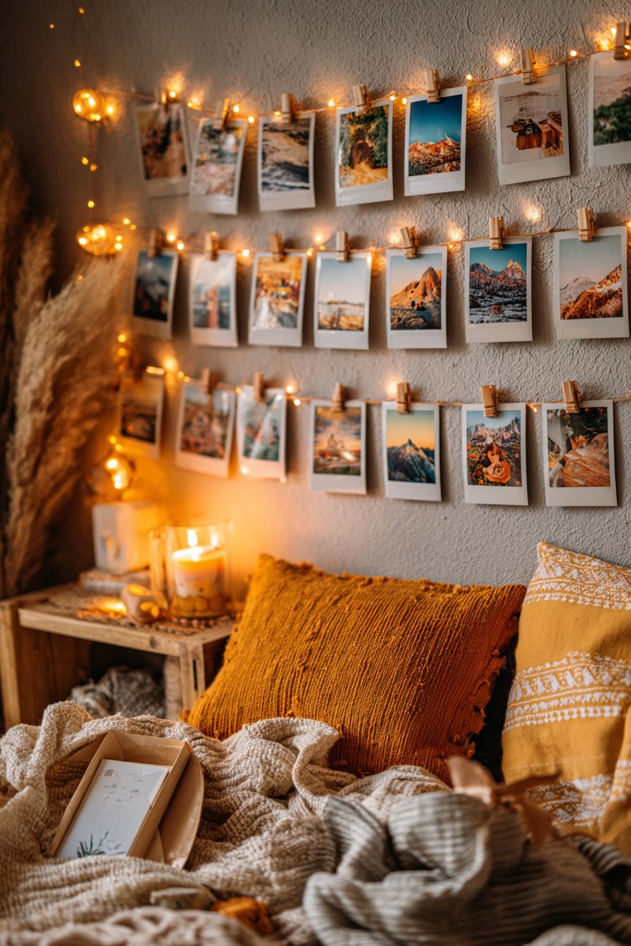 The cozy bed with layered textiles positioned below creates comfortable viewing space where inhabitants can lie back and contemplate their displayed memories. Warm string light glow supplements natural daylight, creating dreamy ambiance particularly appealing during evening hours. The entire display feels personal and authentic, celebrating the present moment and current relationships rather than fixed family history.