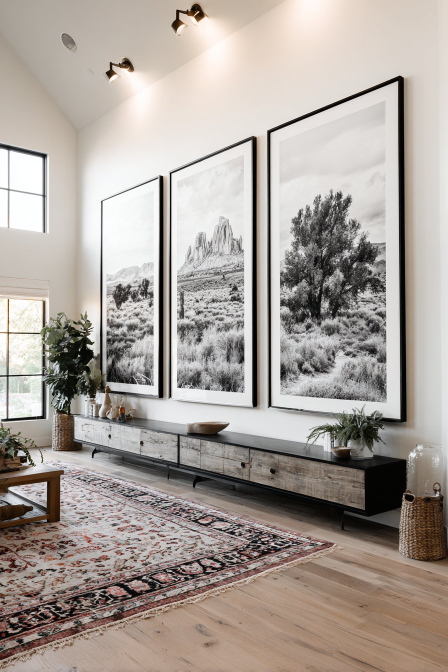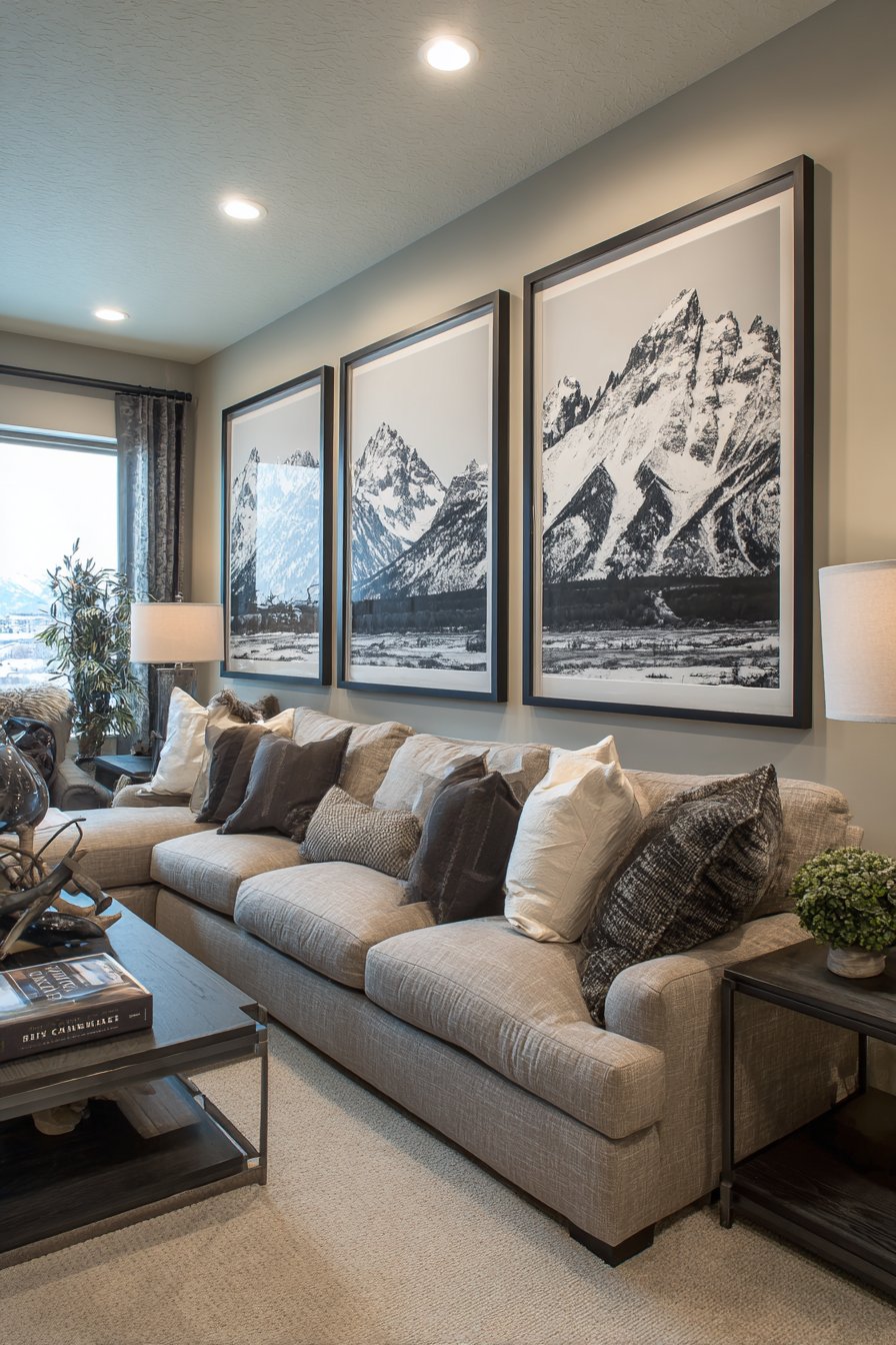 Cinematic drama characterizes this high-impact living room display featuring massive black and white landscape photography. Three enormous 36×48 inch frames in ultra-thin black metal profiles display dramatic landscape images—perhaps mountainscapes, seascapes, or desert vistas captured with professional photography techniques. The frames hang in a horizontal line with minimal spacing creating almost continuous visual experience that feels like looking through windows into epic landscapes. The sheer scale transforms photography from decoration into immersive visual experience.