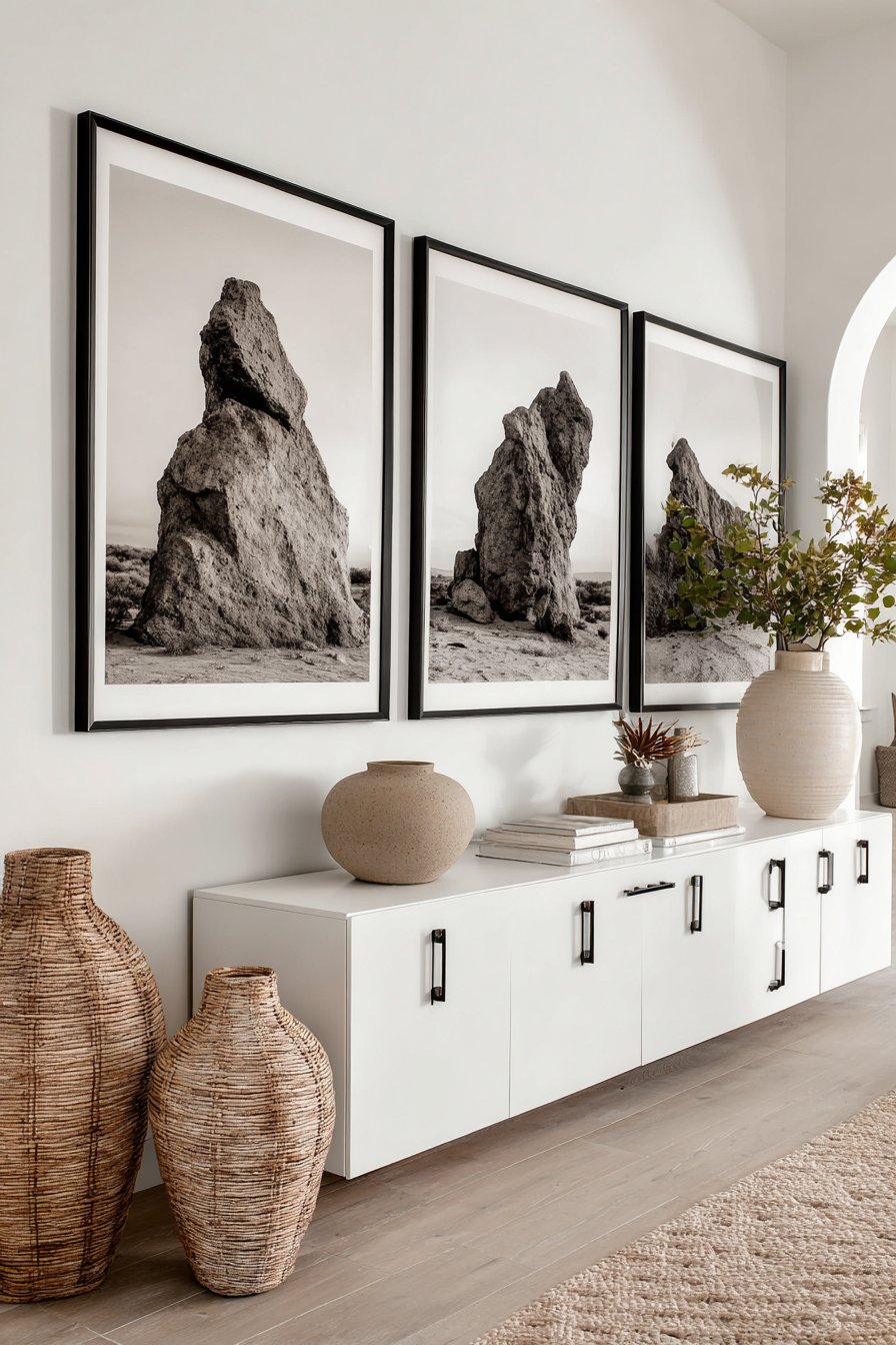 Sometimes restraint makes the strongest statement, as proven by this minimalist approach featuring just three large frames. Each 24×36 inch frame in light oak contains an abstract line drawing executed in black ink on pristine white backgrounds. The frames hang in a perfect horizontal row with mathematical precision in their spacing, creating a display that embodies Scandinavian design principles of simplicity, functionality, and understated elegance. This approach recognizes that walls don’t always need to be completely filled—intentional negative space can be as important as the art itself.