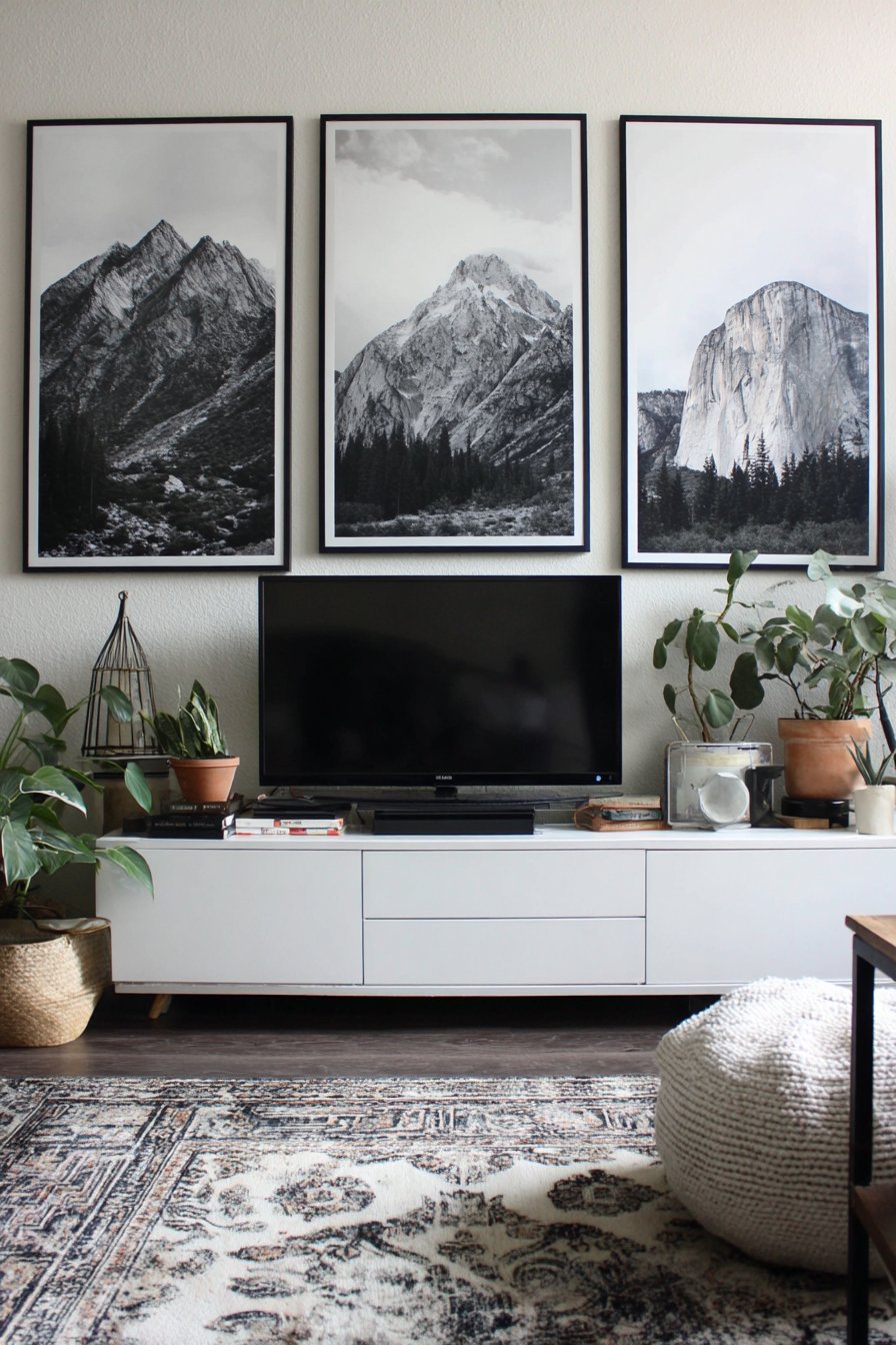 The simplicity of this linear arrangement shouldn’t be mistaken for lack of sophistication. By limiting the display to five substantial pieces rather than numerous small frames, this approach embraces the “less is more” philosophy that characterizes mid-century modern design. Each photograph receives individual attention rather than competing for notice within a crowded composition. The even spacing between frames creates a rhythm that’s mathematical in its precision, yet the organic subject matter of landscape photography softens what could otherwise feel too rigid or industrial.