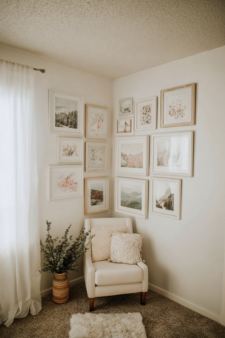 Key Design Tips: Start at the corner with your largest or most important piece positioned slightly to one side rather than directly in the corner. Work outward along both walls, decreasing frame density as you move away from the corner. Vary frame sizes while maintaining a consistent color palette—mixing white and light wood creates visual interest without chaos. Allow at least 6-8 inches of space between the corner and your first frame to prevent a cramped appearance. Use smaller frames as you reach the edges of your arrangement to create a natural fade-out effect.
