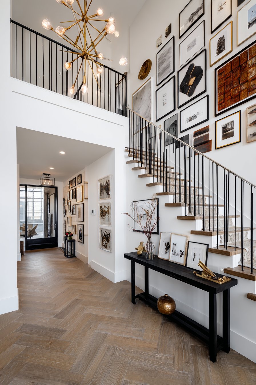 The challenge of designing for such dramatic height lies in creating visual flow that works from multiple vantage points—from the entry level looking up, from the second floor looking down, and from the staircase at intermediate heights. Successful execution requires careful attention to the relationship between larger anchor pieces and smaller supporting frames, ensuring that no single area feels too dense or too sparse when viewed from any angle. The inclusion of a console table at ground level helps anchor the massive vertical display, providing a logical starting point for the eye before it travels upward.