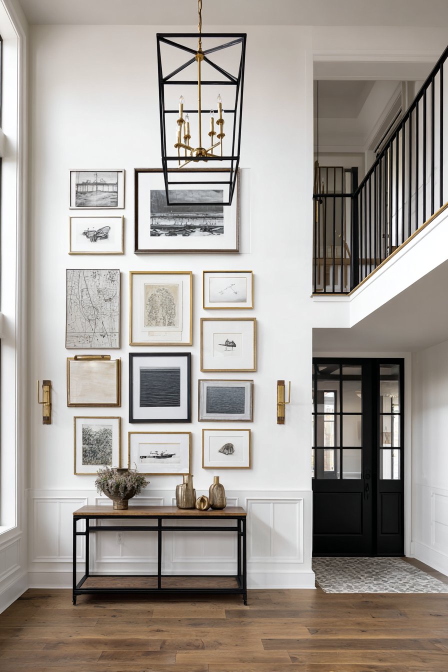 Grand architectural spaces demand equally impressive design solutions, and few picture wall ideas deliver impact like a floor-to-ceiling gallery wall in a two-story entryway. This expansive display spans the entire vertical height of the space, incorporating over thirty frames in a carefully balanced asymmetrical arrangement. The frame finishes—matte black, brass, and dark walnut—provide enough variety to maintain visual interest across such a large expanse while maintaining sufficient cohesion to read as a unified installation. The diverse content including travel photography, abstract art, and family heirlooms creates a personal museum that immediately communicates the homeowner’s sophistication and life experiences.