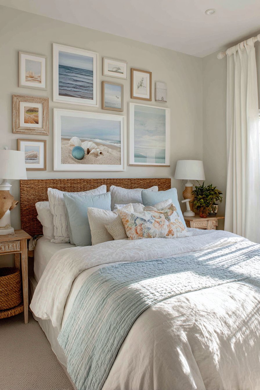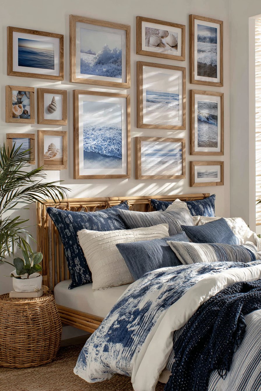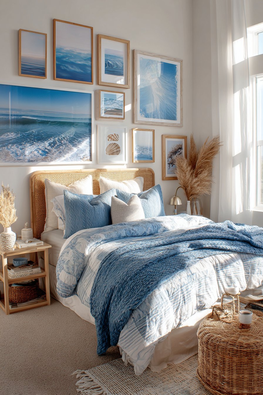 The relationship between the gallery wall and the woven rattan headboard below creates a layered coastal narrative. The headboard’s natural texture echoes the rope elements in the frames while its warm honey tones provide gentle contrast to the cool blue palette above. Natural light flooding through bedroom windows mimics the bright, clear quality of seaside illumination, making the blues appear particularly vibrant during midday hours while taking on deeper, more mysterious tones during evening hours.