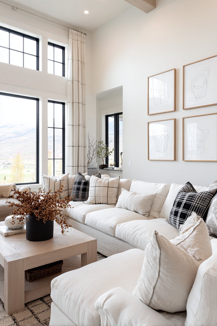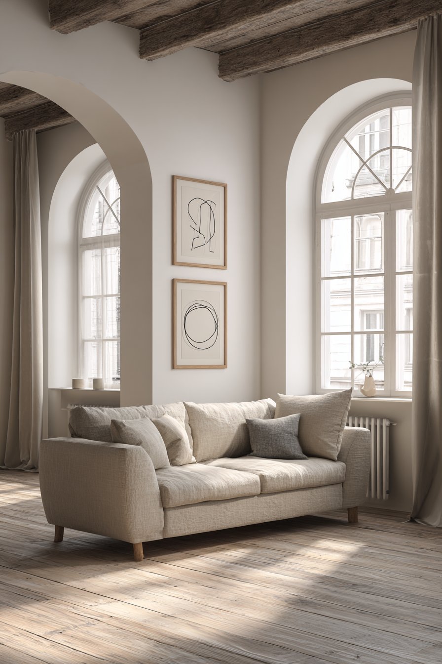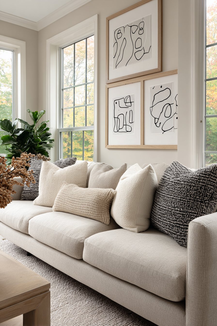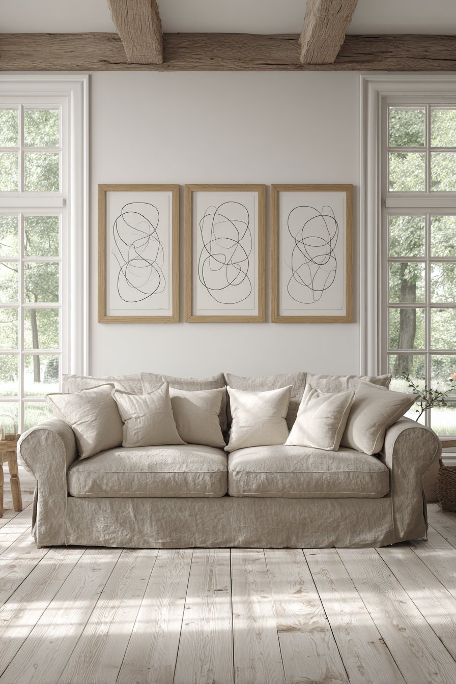 The power of this minimal arrangement lies in its confidence and clarity. By limiting the display to three substantial pieces rather than numerous smaller frames, each artwork receives undivided attention. The abstract line drawings provide visual interest through their gestural quality and varying line weights without introducing color that might compete with other room elements. The light oak frames add just enough warmth to prevent the black and white artwork from feeling cold or sterile, creating a bridge between the art and the neutral linen sofa positioned below.