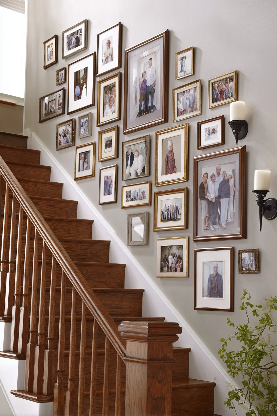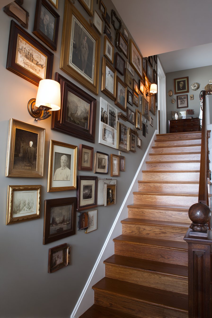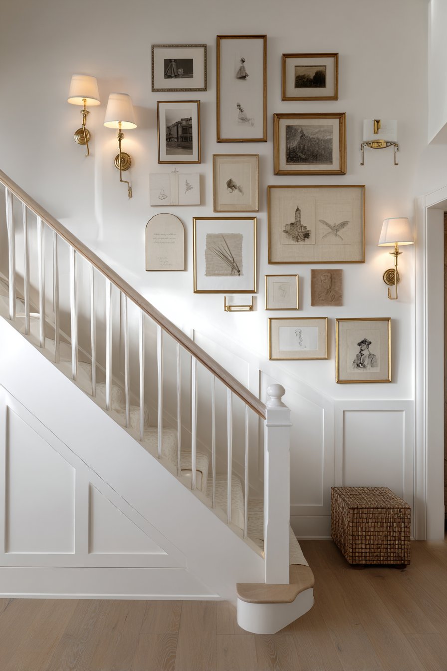 Stairways present unique opportunities for picture wall displays that evolve as viewers move through space. This traditional approach positions frames of varying sizes in matching antique gold finish along the stairway wall, following the ascending angle created by the stairs themselves. The vintage family portraits and heirloom artwork contained within these frames create a literal journey through family history as inhabitants climb from one floor to another. Each frame is carefully positioned to maintain consistent spacing from the stair rail, creating a diagonal line that feels both dynamic and orderly.