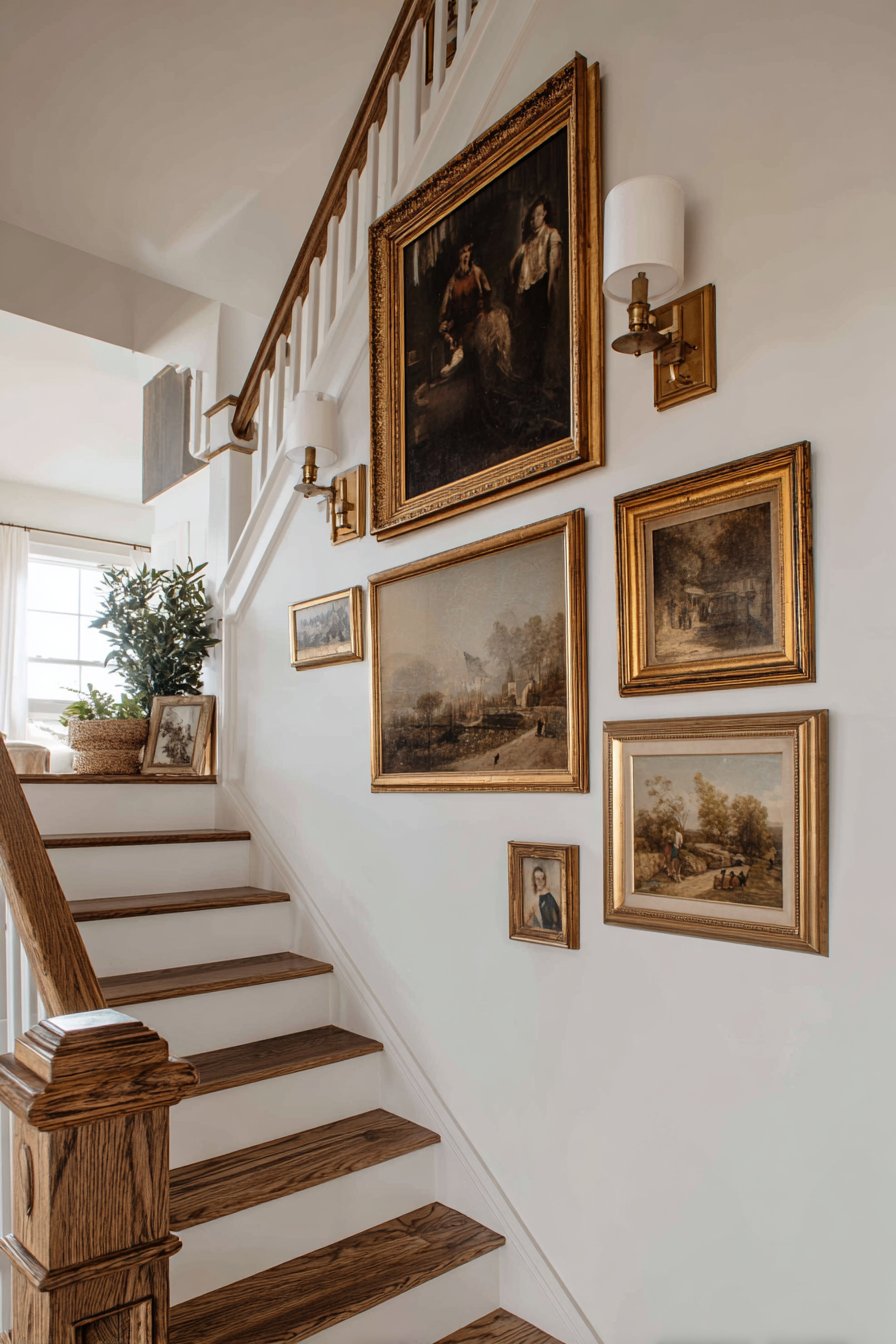 The challenge of stairway galleries lies in creating an arrangement that looks intentional and balanced despite the angled orientation. Unlike flat walls where frames can be arranged in grids or organic clusters, stairway displays must account for the diagonal sightline created by ascending or descending the stairs. The varying frame sizes prevent monotony across the long expanse while the unified antique gold finish provides cohesion. The classic wooden banister adds warmth that complements the gold frames, creating a rich, traditional aesthetic that speaks to permanence and legacy.