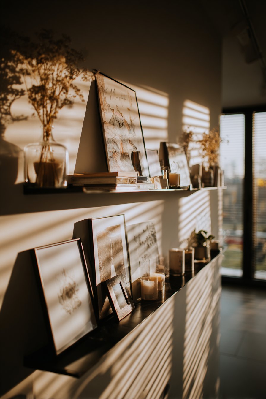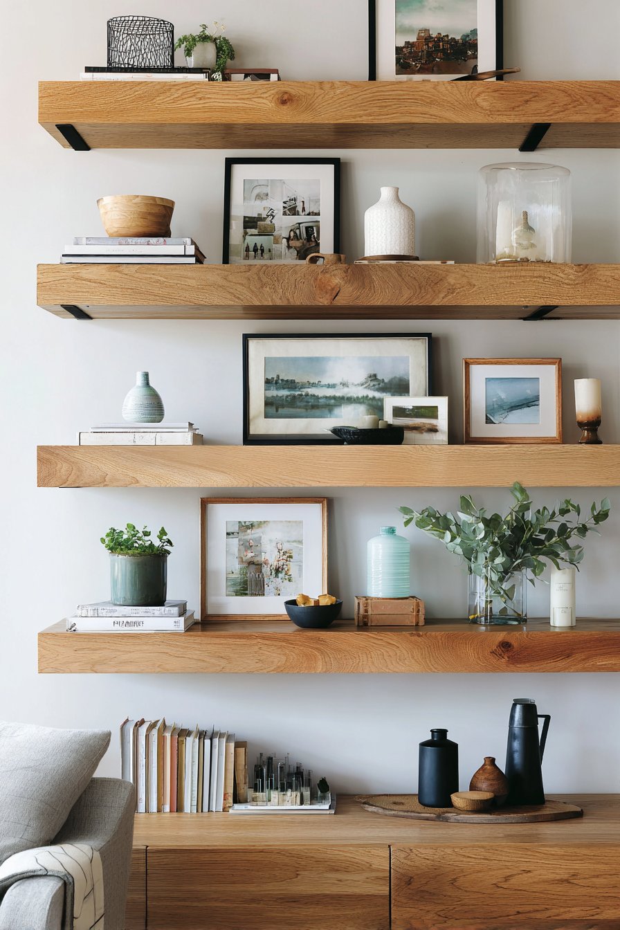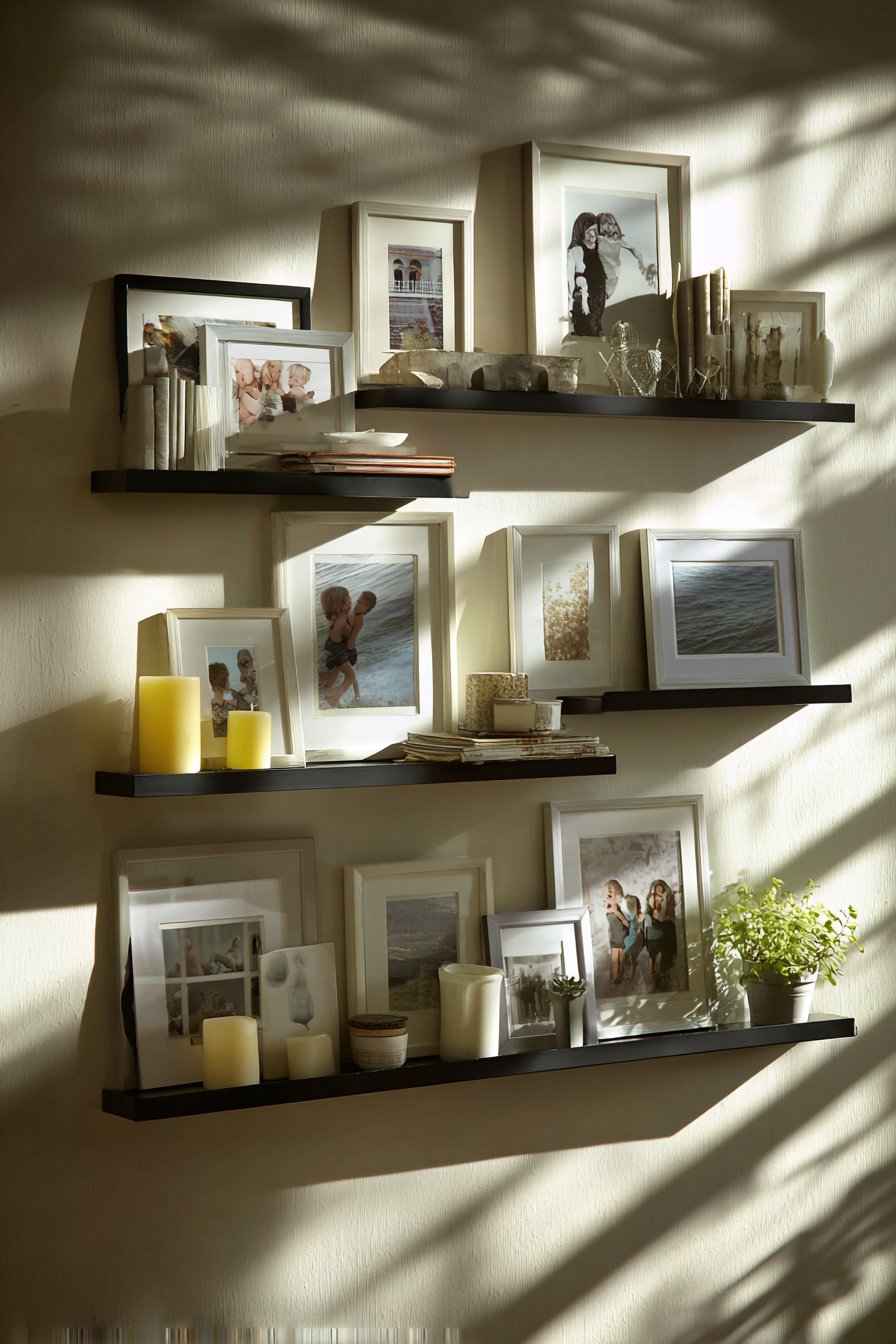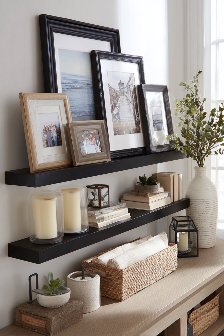 Key Design Tips: Choose ledges with a front lip at least 2 inches deep to securely hold frames and prevent slipping. Space ledges 12-15 inches apart vertically to accommodate various frame heights without overcrowding. Mix frame sizes and orientations, leaning some frames in front of others to create depth. Limit decorative objects to no more than 20% of the display to keep focus on photography. Include small felt pads under frame corners to protect ledge surfaces and improve stability.