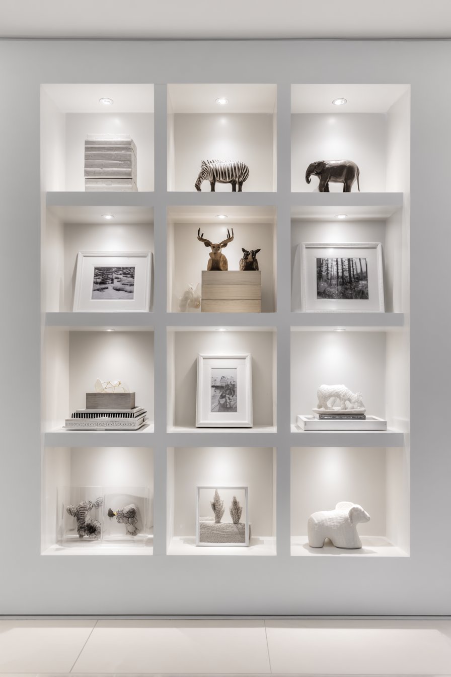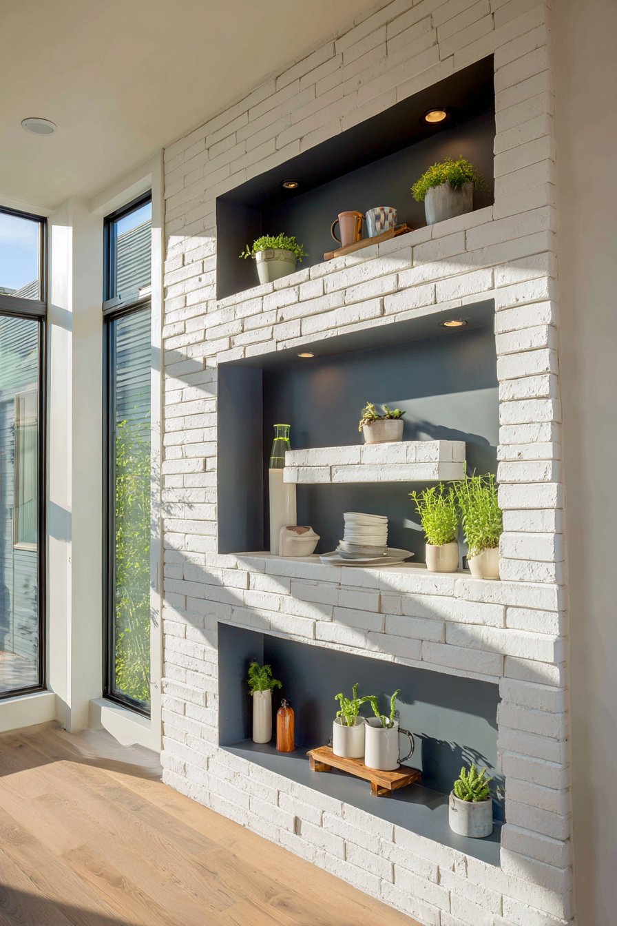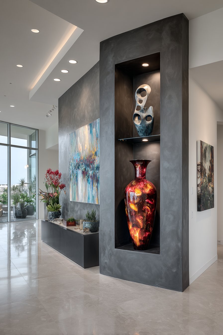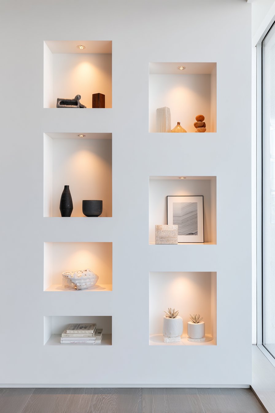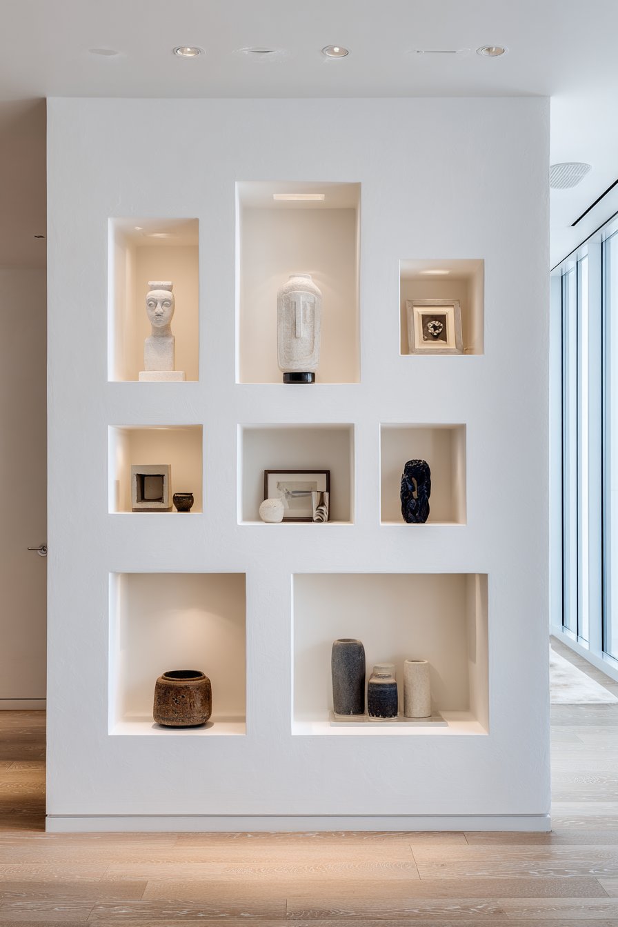 - Consider installing glass shelves within some niches for displaying smaller items at varied heights