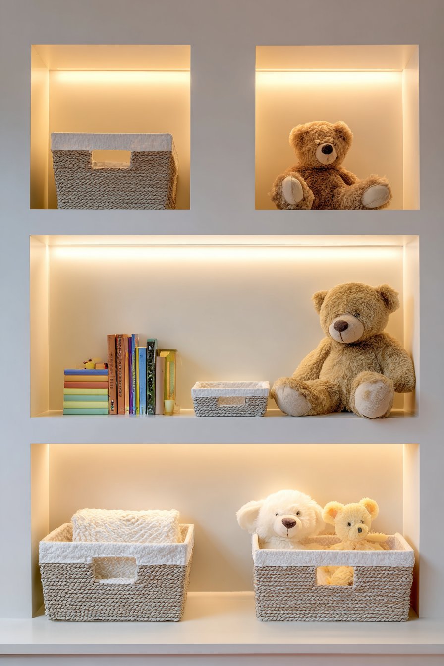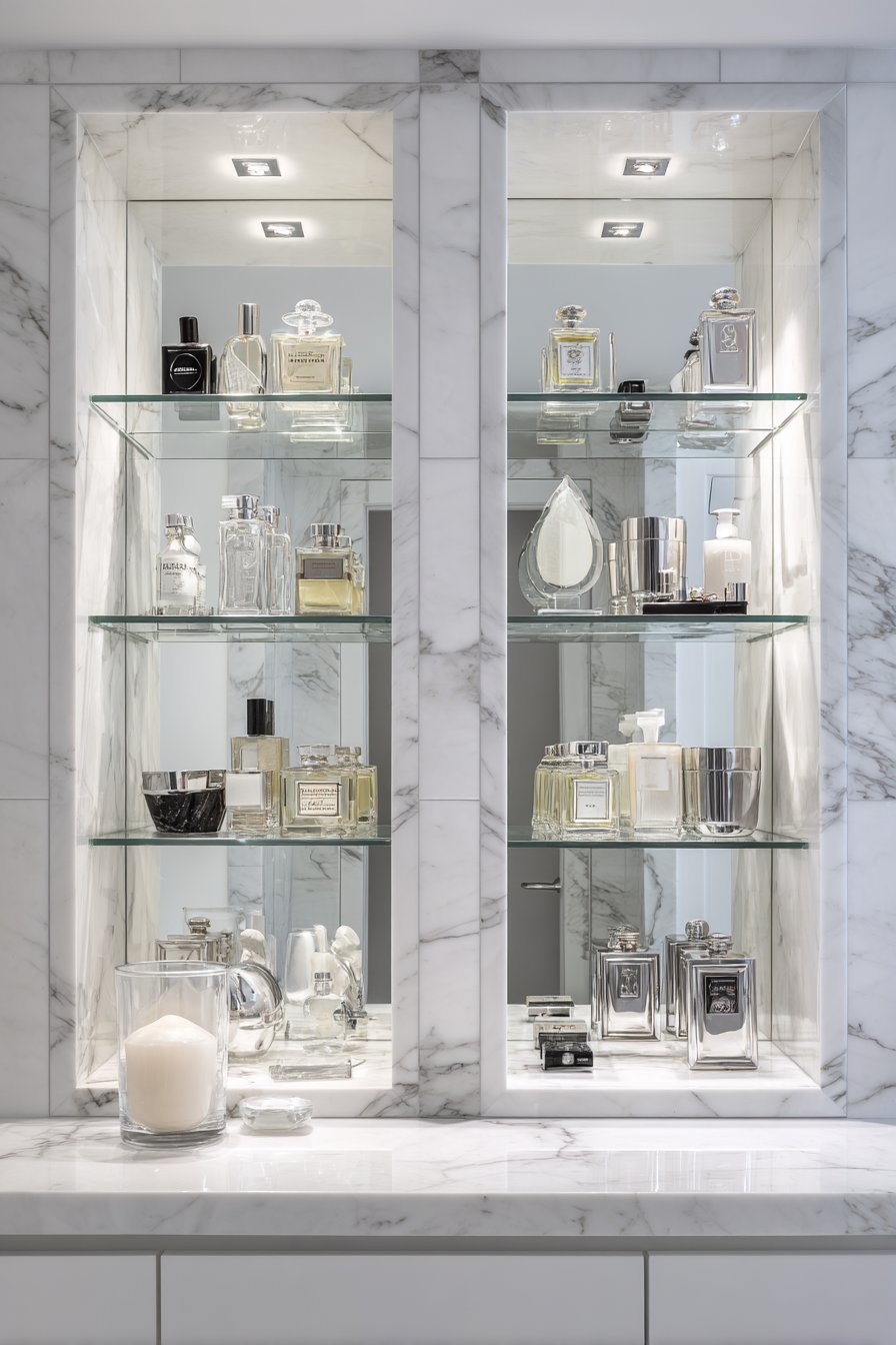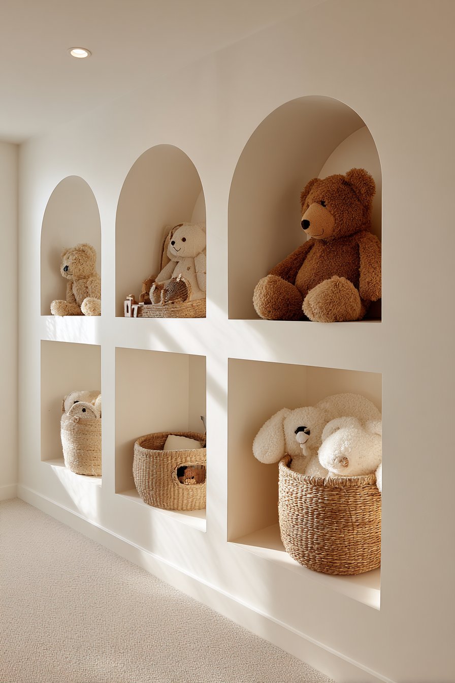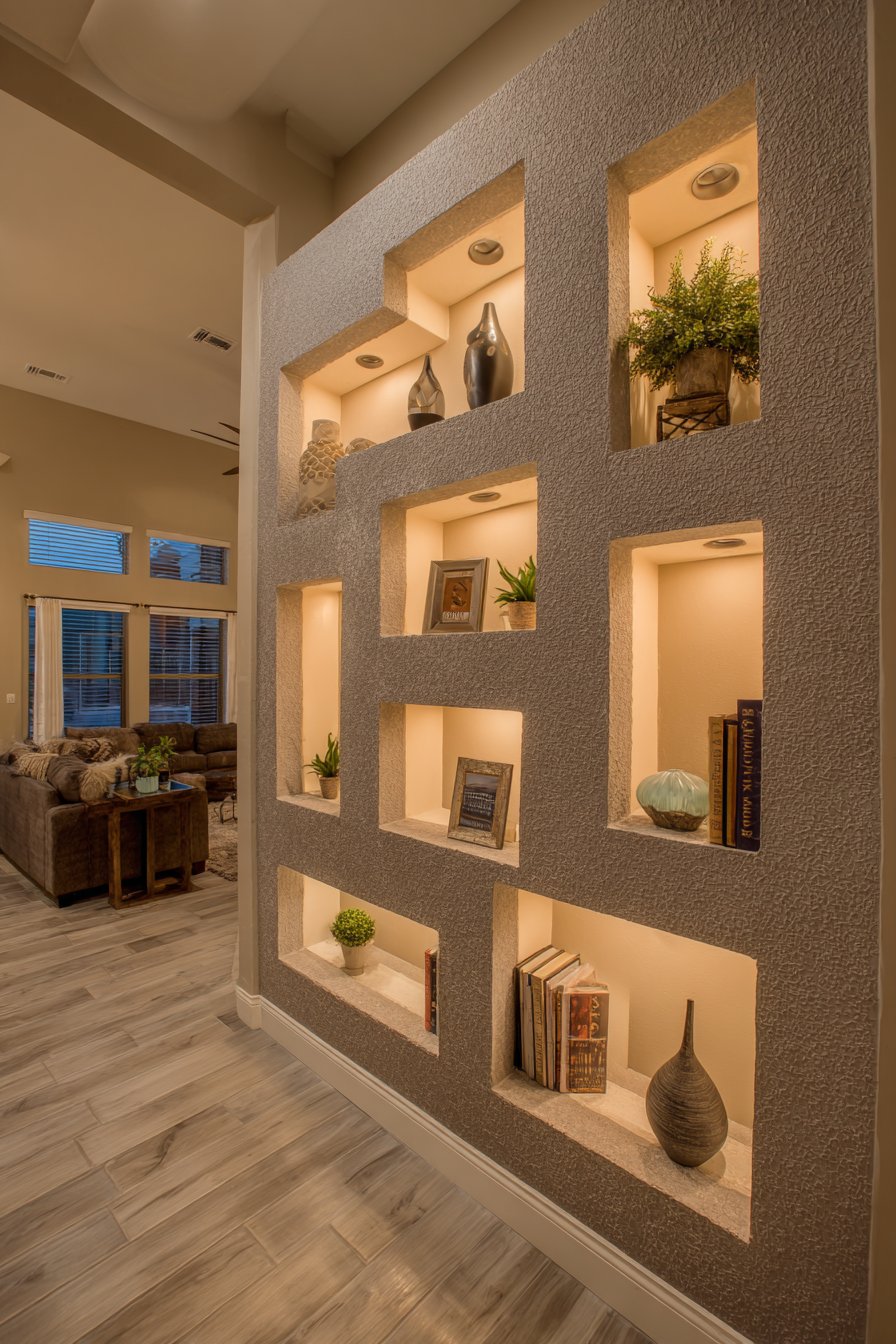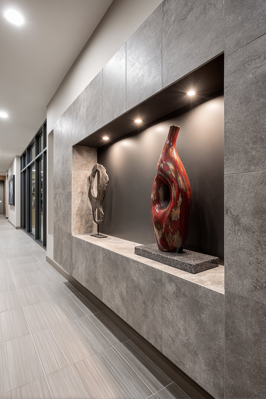 - Consider installing glass shelves within some niches for displaying smaller items at varied heights