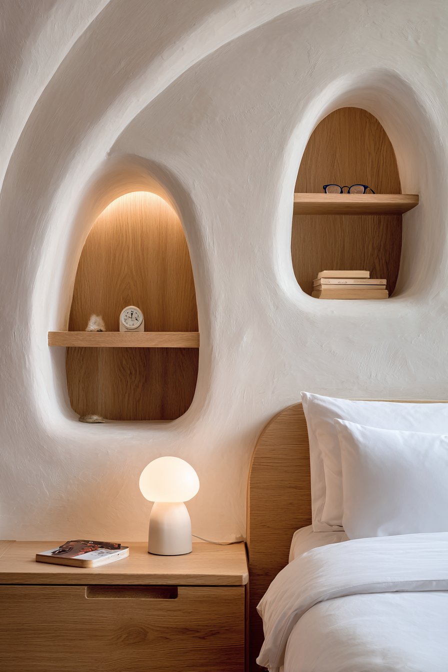 Each niche features natural oak wood shelving that introduces warmth to the otherwise monochromatic palette, creating a pleasing contrast between the cool white walls and organic wood tones. This material choice connects the architectural feature to the broader bedroom design while providing a stable, attractive surface for bedside essentials. The depth of each recess has been carefully calculated to accommodate reading glasses, a small alarm clock, and a minimalist table lamp without items protruding beyond the wall plane, maintaining the clean lines that define the space.