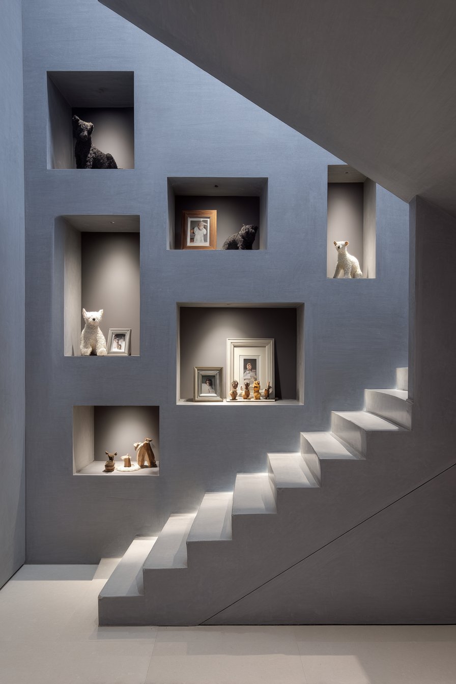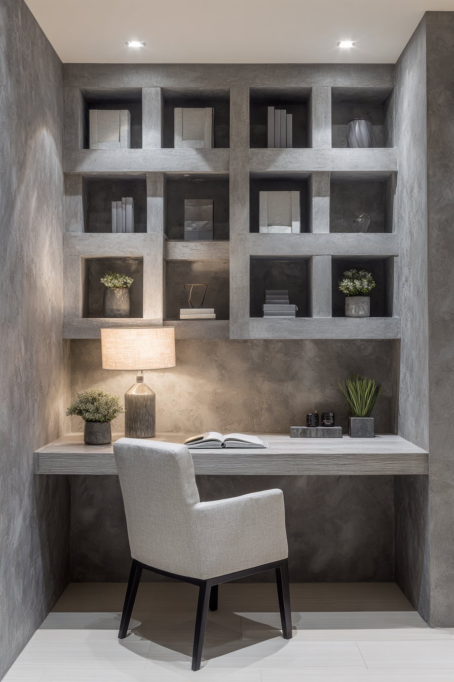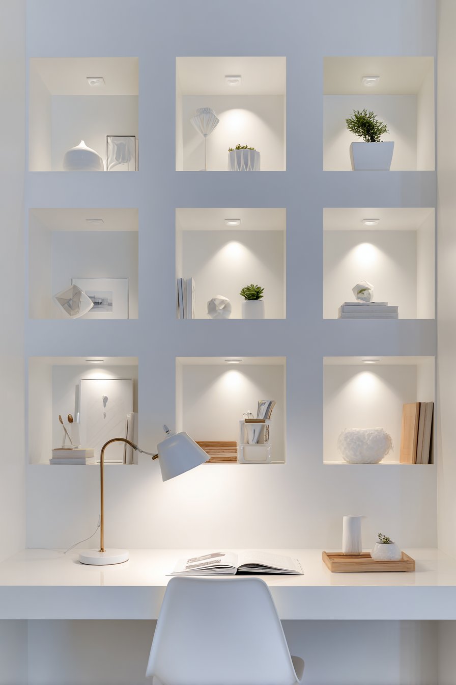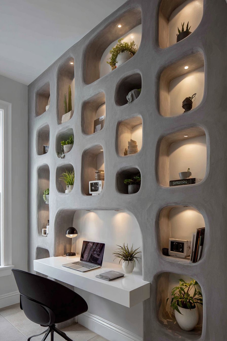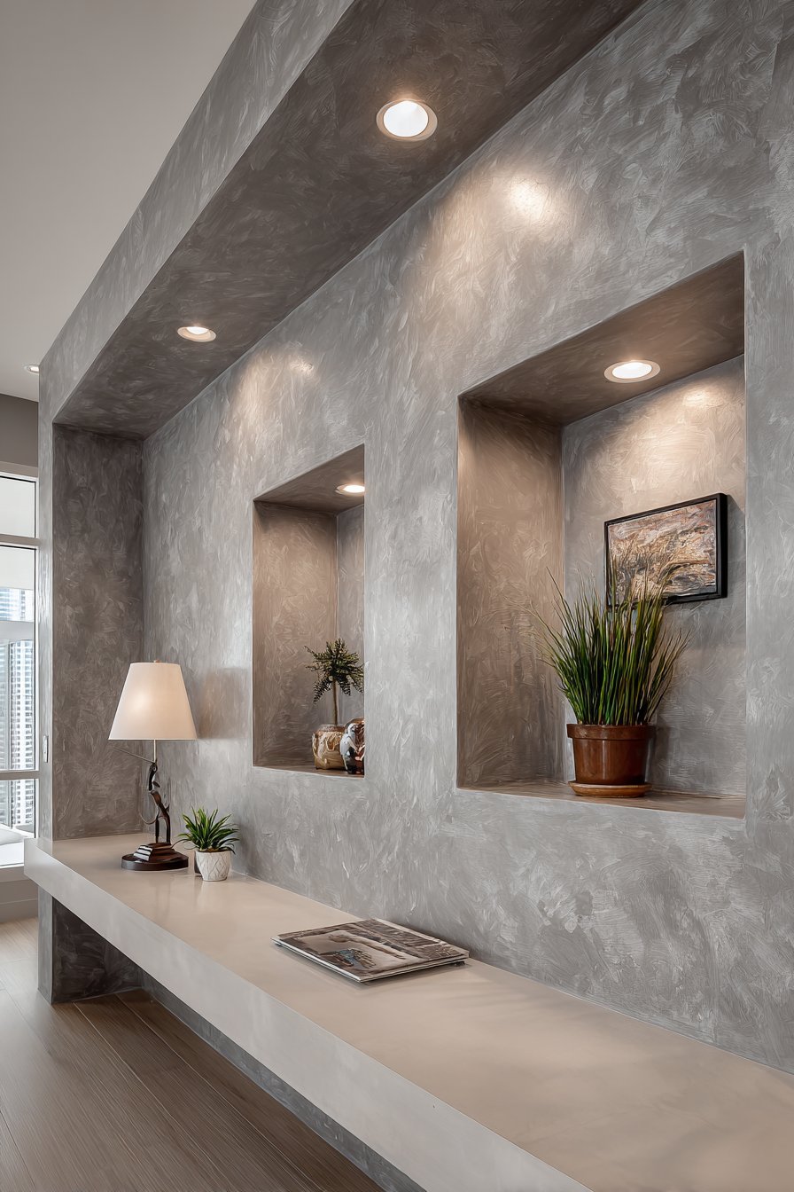The genius of this design lies in its combination of functional display and ambient lighting. Each niche becomes a miniature stage where sculptural ceramic vases, carefully stacked art books, small potted succulents, and modern decorative objects perform for viewers. The varied depths and sizes prevent monotony while allowing for diverse display options—larger niches accommodate substantial statement pieces, while smaller recesses highlight delicate treasures. The textured gray plaster wall provides a sophisticated neutral backdrop that allows the displayed items to truly shine without competing for attention.