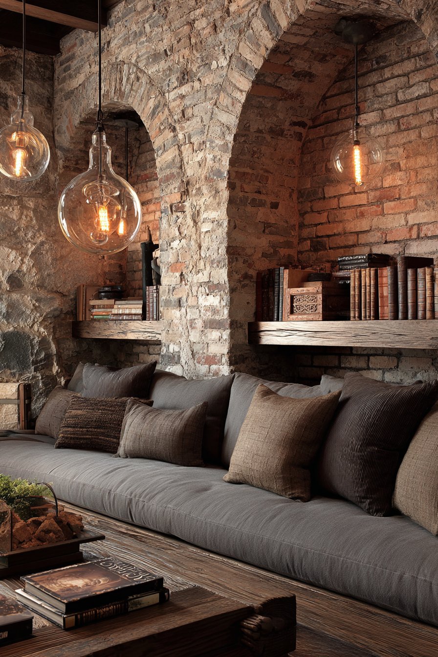The stacked stone shows natural color variation in warm grays and taupes, with each stone displaying unique patterns, textures, and mineral inclusions that create organic visual richness. The dimensional quality of the stone surface—some pieces protruding slightly, others recessed, all creating shadow play—adds depth that rewards closer inspection. The vertical niches interrupt the stone field’s horizontal coursing, creating contrast through their strong vertical emphasis while their substantial size balances the fireplace’s horizontal linearity.