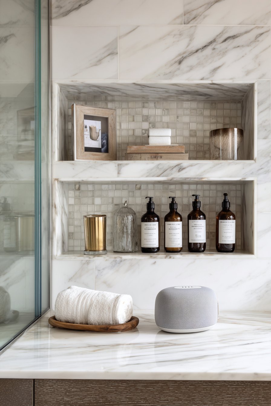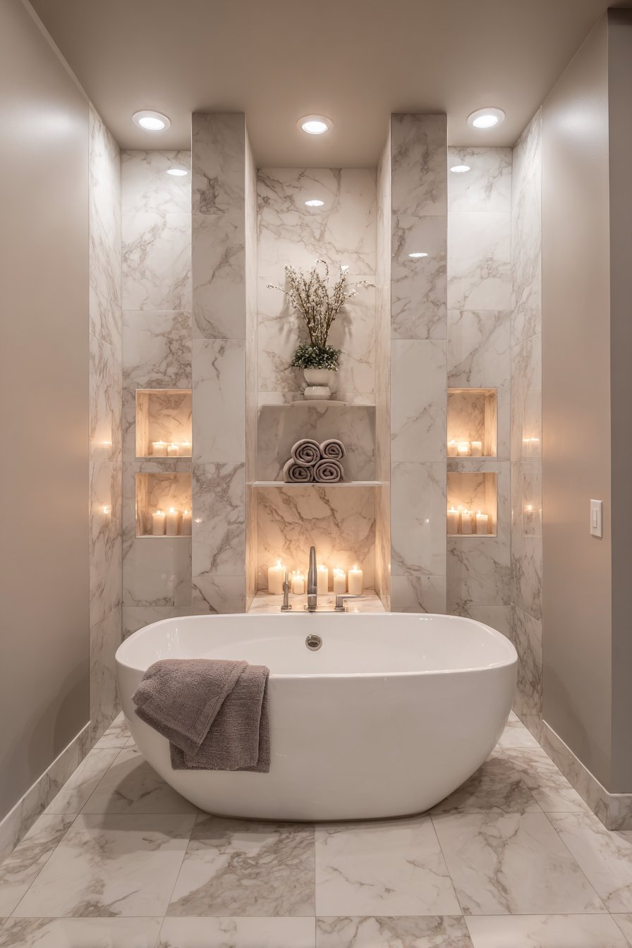 The master bathroom achieves spa-like sophistication through symmetrical vertical niches flanking a luxurious freestanding soaking tub. These deep recesses carved into marble-look porcelain tile walls serve both aesthetic and functional purposes, providing convenient storage for rolled towels, aromatic candles, and spa accessories while creating architectural interest that elevates the bathing area into a true sanctuary. The three evenly spaced internal shelves within each niche allow for organized display that remains accessible yet visually appealing.