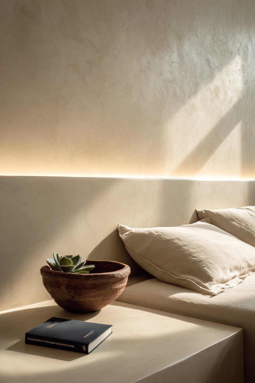 The modern bedroom embraces simplicity and functionality with symmetrical recessed wall niches that replace traditional nightstands entirely. Carved directly into soft white plaster walls flanking the bed, these niches represent the ultimate expression of minimalist design philosophy—eliminating furniture while maintaining essential bedside functionality. The integrated LED backlighting creates a gentle, ambient glow that serves as a sophisticated alternative to table lamps, providing just enough illumination for late-night reading or early morning routines without harsh overhead lighting.